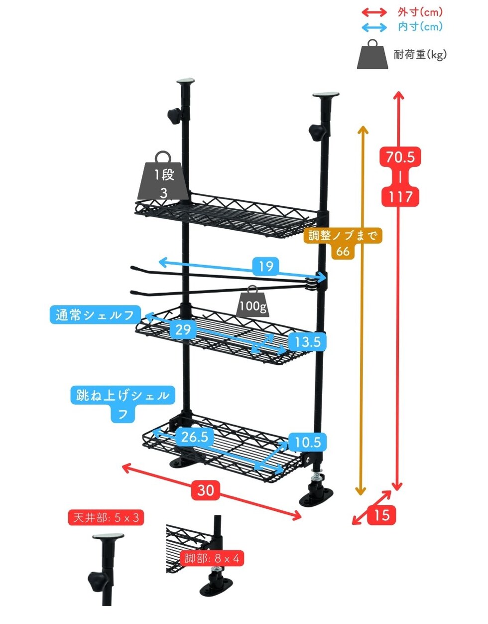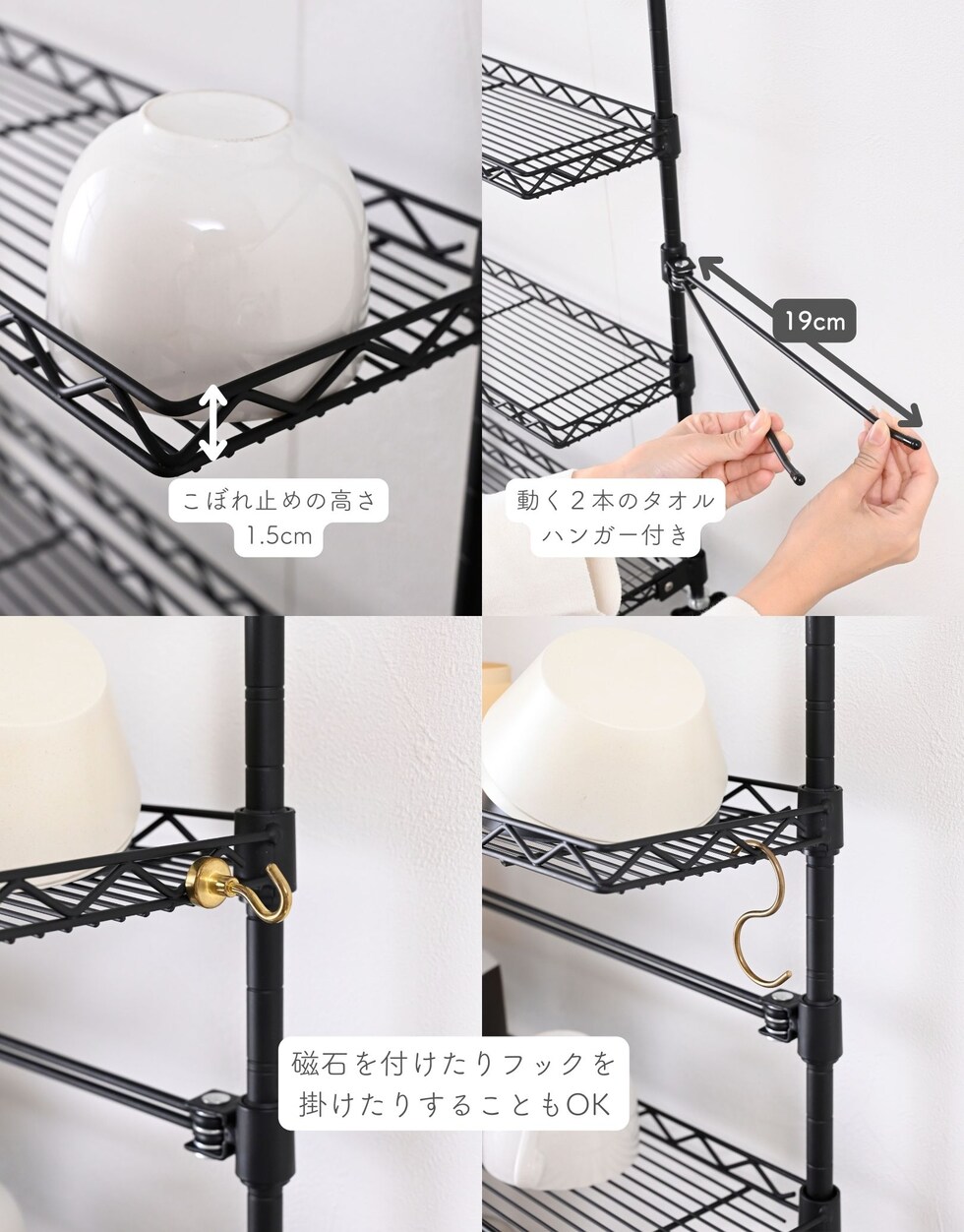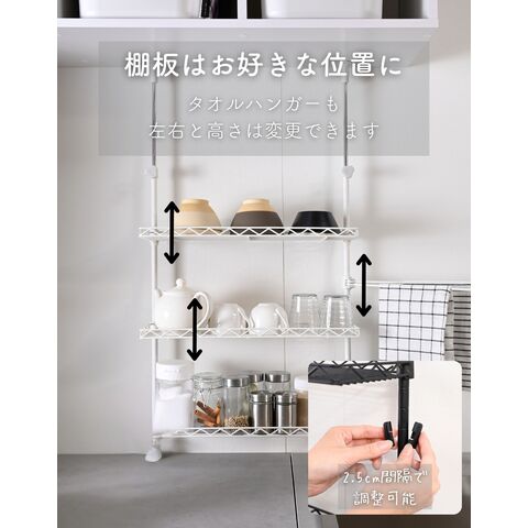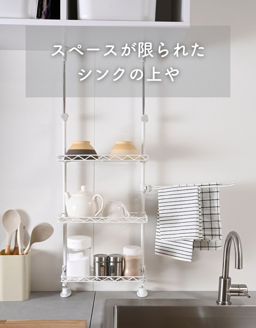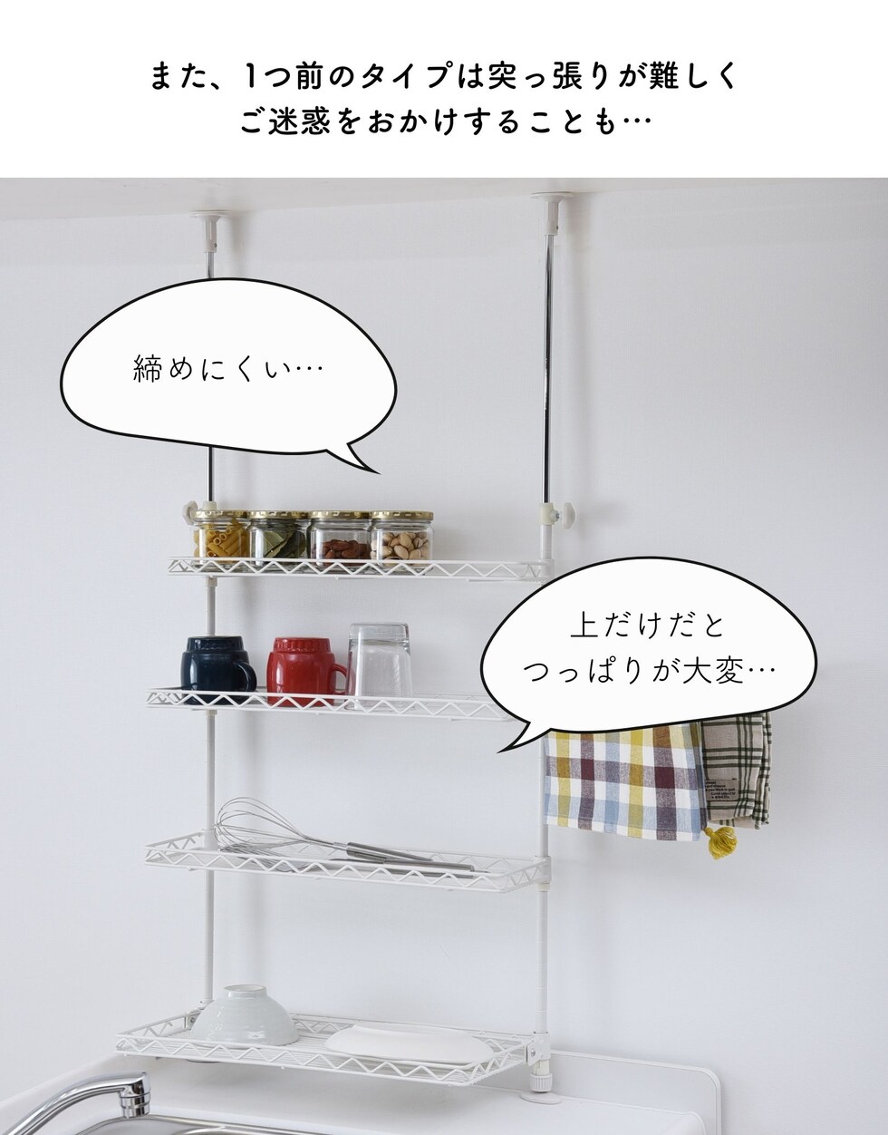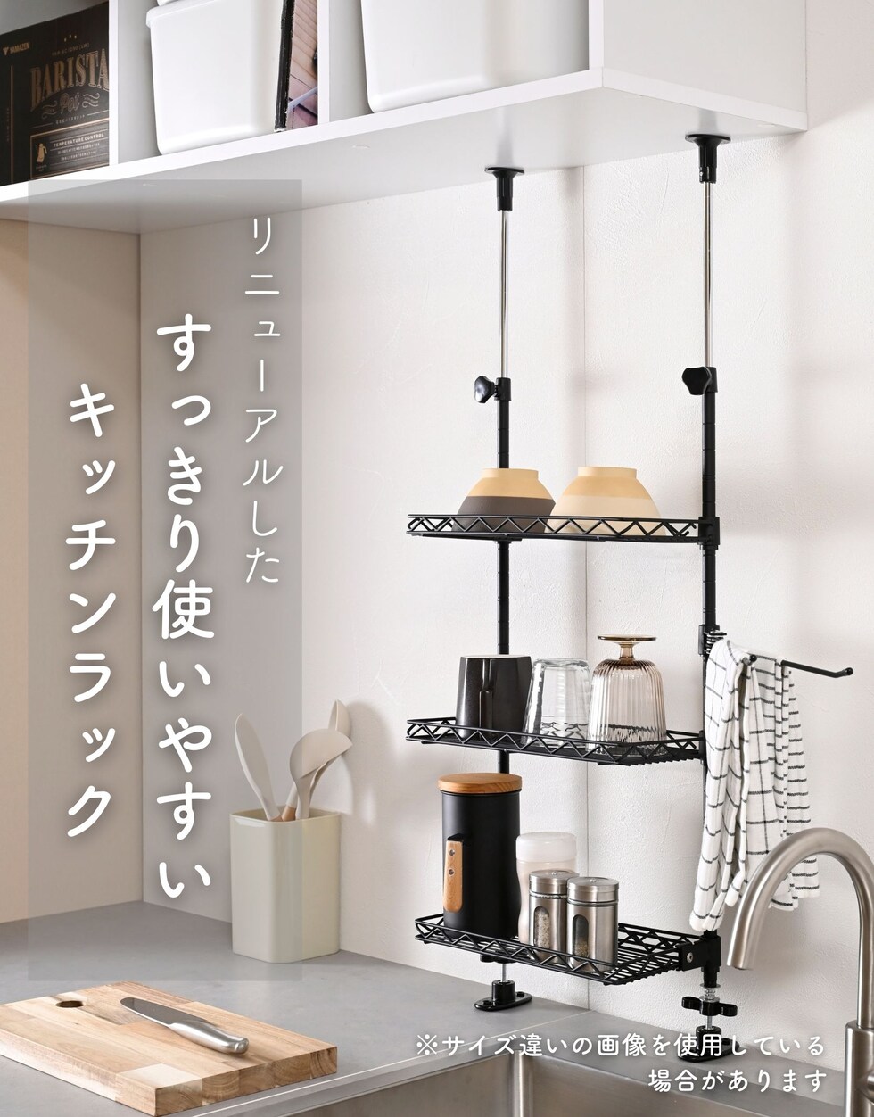 | 商品説明 | ●※2025年12月8日より、リニューアルモデルでの販売となります。 棚板を4→3段に、上下で突っ張りの固定ができるようになりました。 ※2017年2月1日より、リニューアルモデルでの販売となります。棚板が1段追加、棚にこぼれ止めが追加、塗装が粉体塗装 ●設置場所が柔軟な、突っ張り固定式キッチンラック ●シェルフを調節できる、スチールラックタイプの棚板3 ●使わない時はたたんでスペースを広く使える跳ね上げシェルフも1枚付属 ●全段、こぼれ止め仕様(約1.5cm) ●シェルフは「カチオン電着塗装」の下処理がされ、水に強い加工 ●2.5cm間隔でシェルフ位置は調整可能 ●左右付け替え可能なふきんハンガー、高さも調節可能 ●2連タオルハンガー:約19cm ●耐荷重: シェルフ(1枚当たり)3kg、跳ね上げシェルフ3kg、2連タオルハンガー(1本あたり)100g、全体 10kg ●シェルフ内寸: 幅29×奥行13.5×高さ1.5cm ●跳ね上げシェルフ: 幅26.5×奥行10.5×高さ1.5cm |