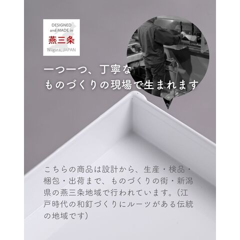 | 商品説明 | ●組立不要、完成品でのお届け(キャスターも取り付け済み) ※本品は隙間に収納して使われる想定です。短辺方向には転倒しやすいので、予めご了承の上ご検討ください。 ●家の中の隙間を活用する、幅10cmのスリムなワゴン収納 ●細身ながらグラグラしないしっかりとしたつくり ●加工、溶接、塗装、仕上げ、工程ごとに丁寧につくられた、MADE IN 燕三条アイテム ●奥行深めの50cm ●耐荷重: 全体21kg、天板3、上段3、中段5、下段10kg ●直線キャスターで前後に出し入れをサポート ●持ち手は、丁寧な面取りがされたざぐり式 ●前後両面に持ち手があるので、本体の向きは左右どちらも対応可能 ●各段には深さ2.5cmの、中・下段にはこぼれ止めも付いていてモノの落下を防止 ●汚れてもササっと拭き取りやすい、光沢のある塗装仕上げ ●収納部内寸: 幅9.5 奥行49.5 高さ(上)14 (中)26 (上)35cm |