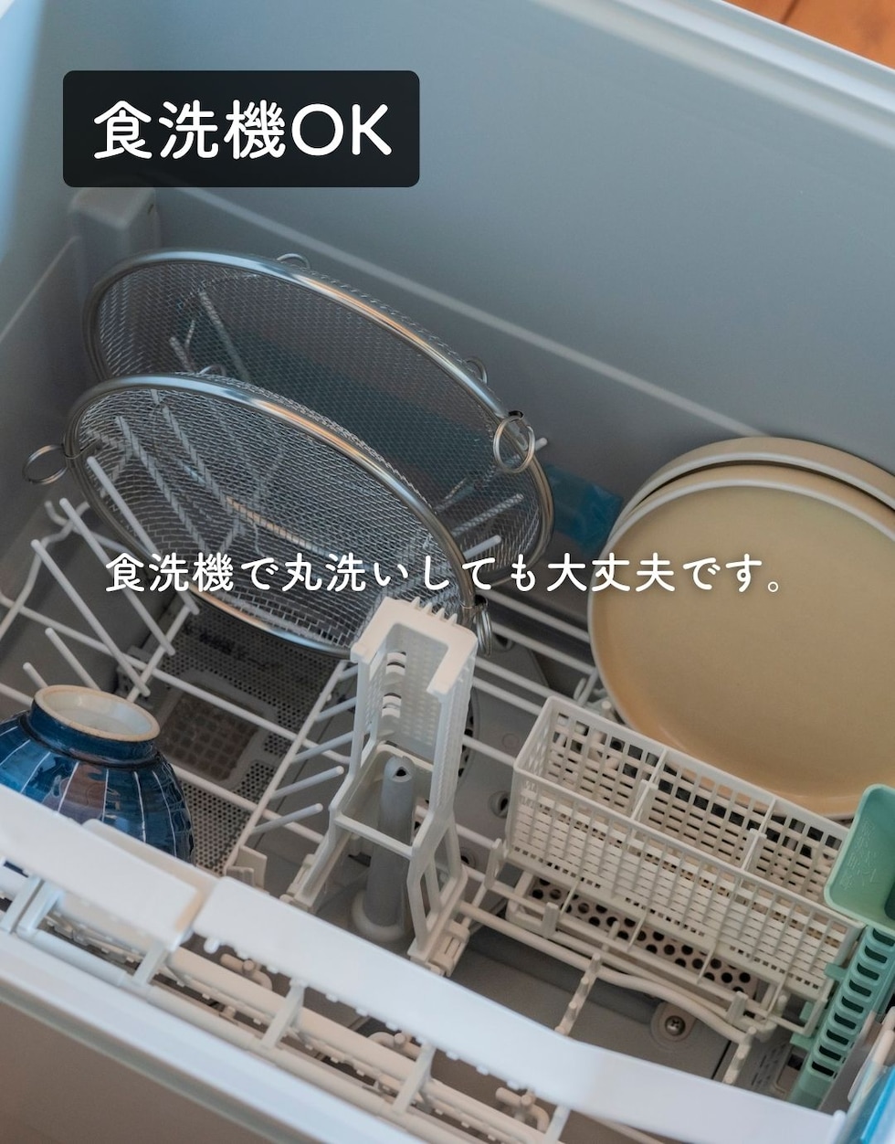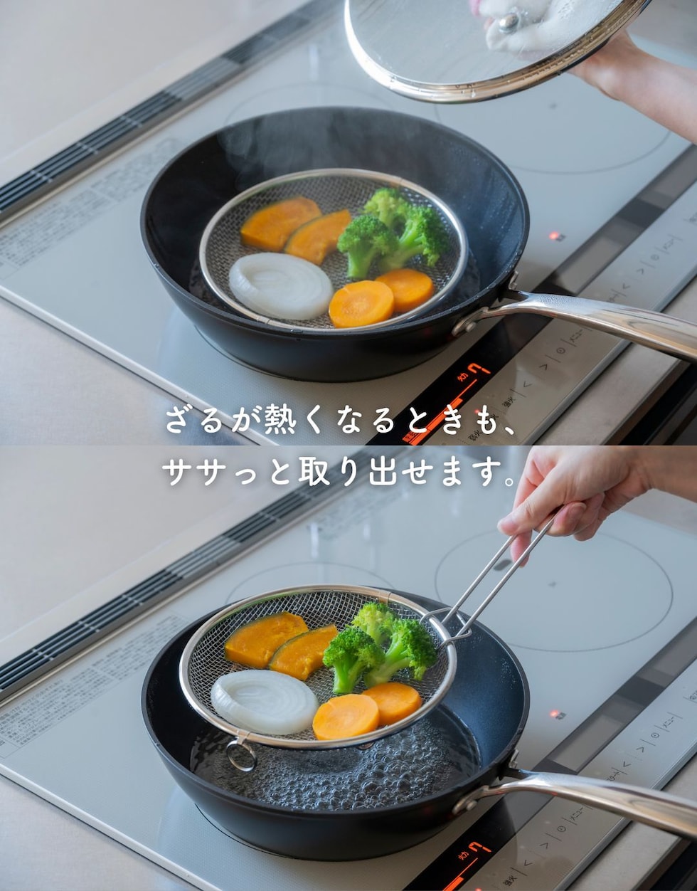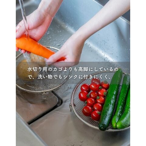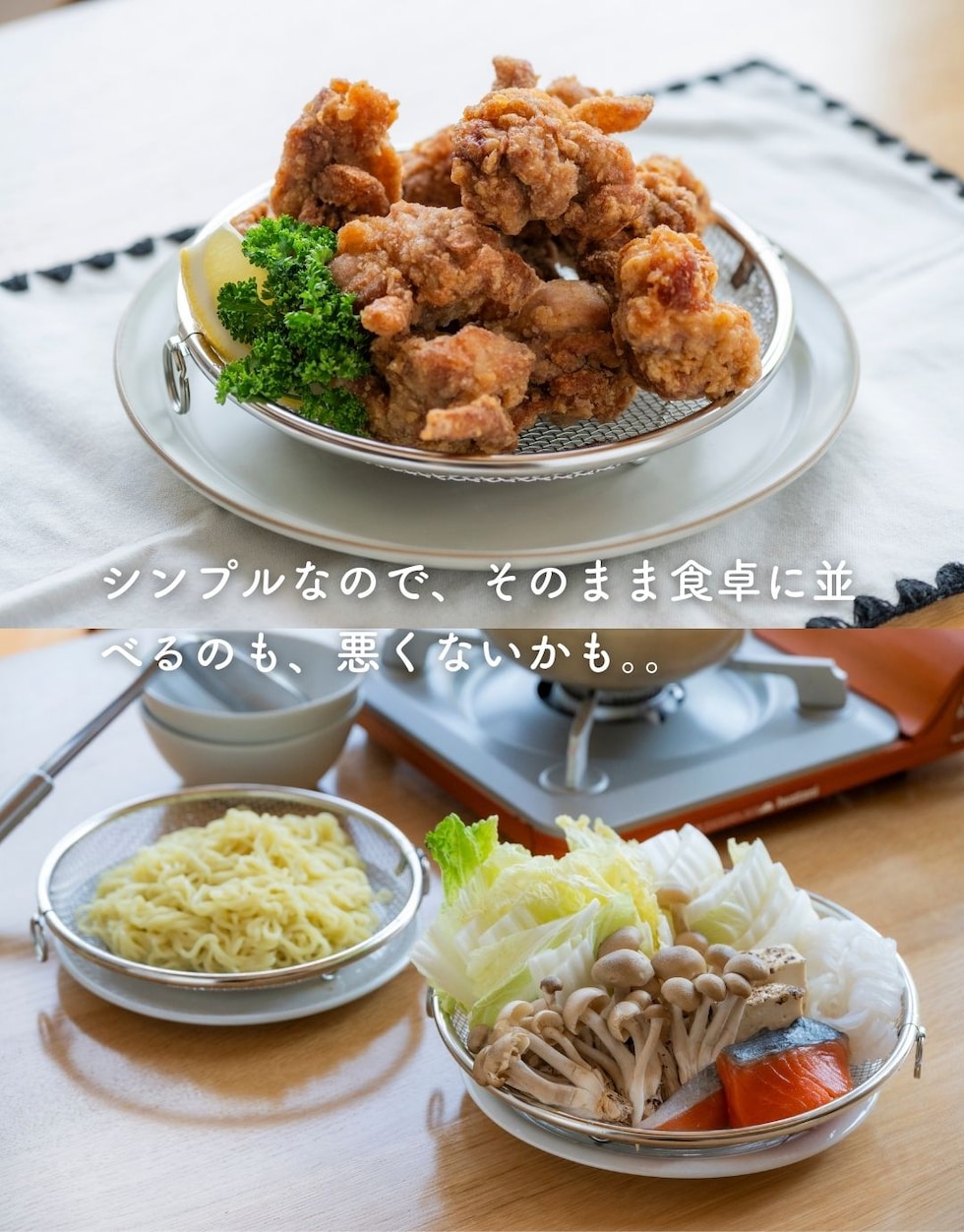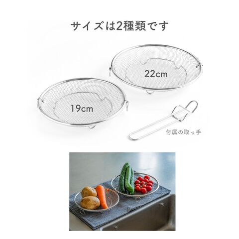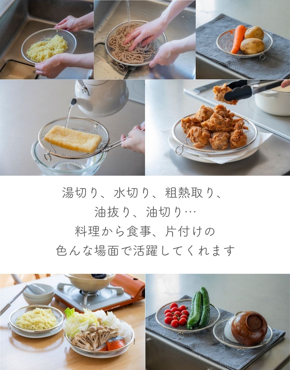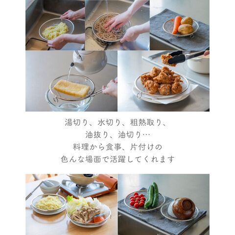 | 商品説明 | ●使う時だけ取っ手を装着する浅型のステンレス製のザル ●便利な持ち上げフック付きで、直接触れずに移動可能 ●取っ手がないから、鍋やフライパンの容量を目いっぱい使える便利設計 ●揚げ物の油切りとしても活躍 ●そのままお皿の中でも収まりが良いので、お皿に移動して食器としてもOK ●シリーズの水切りカゴよりも脚の高さを5mm上げているので、底面が接地しづらく蒸し料理にも最適 ●しっかり振って水切りしたい時も安定する、両サイドリング付き ●吊り下げ収納可能 ●ステンレス製だから、食洗機で丸洗い可能 |