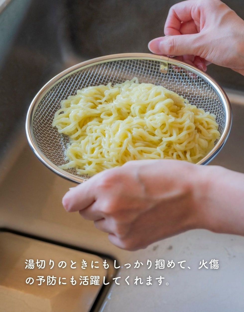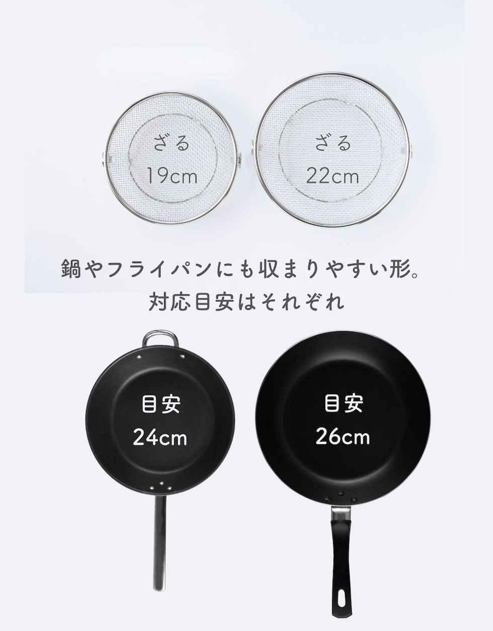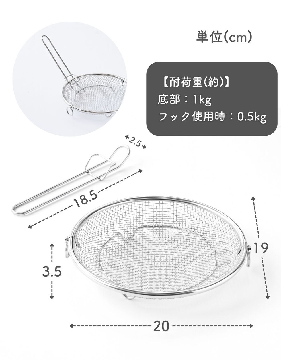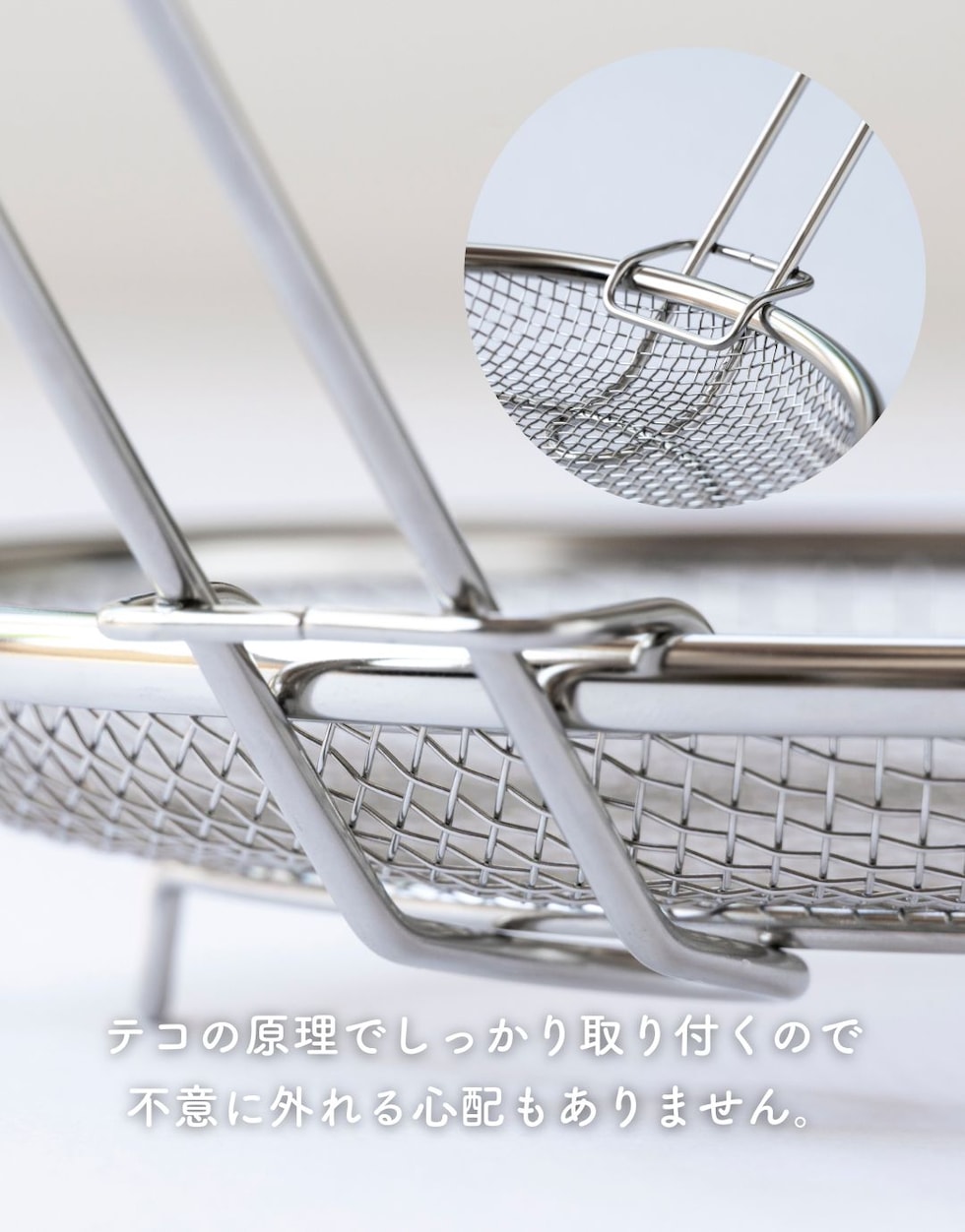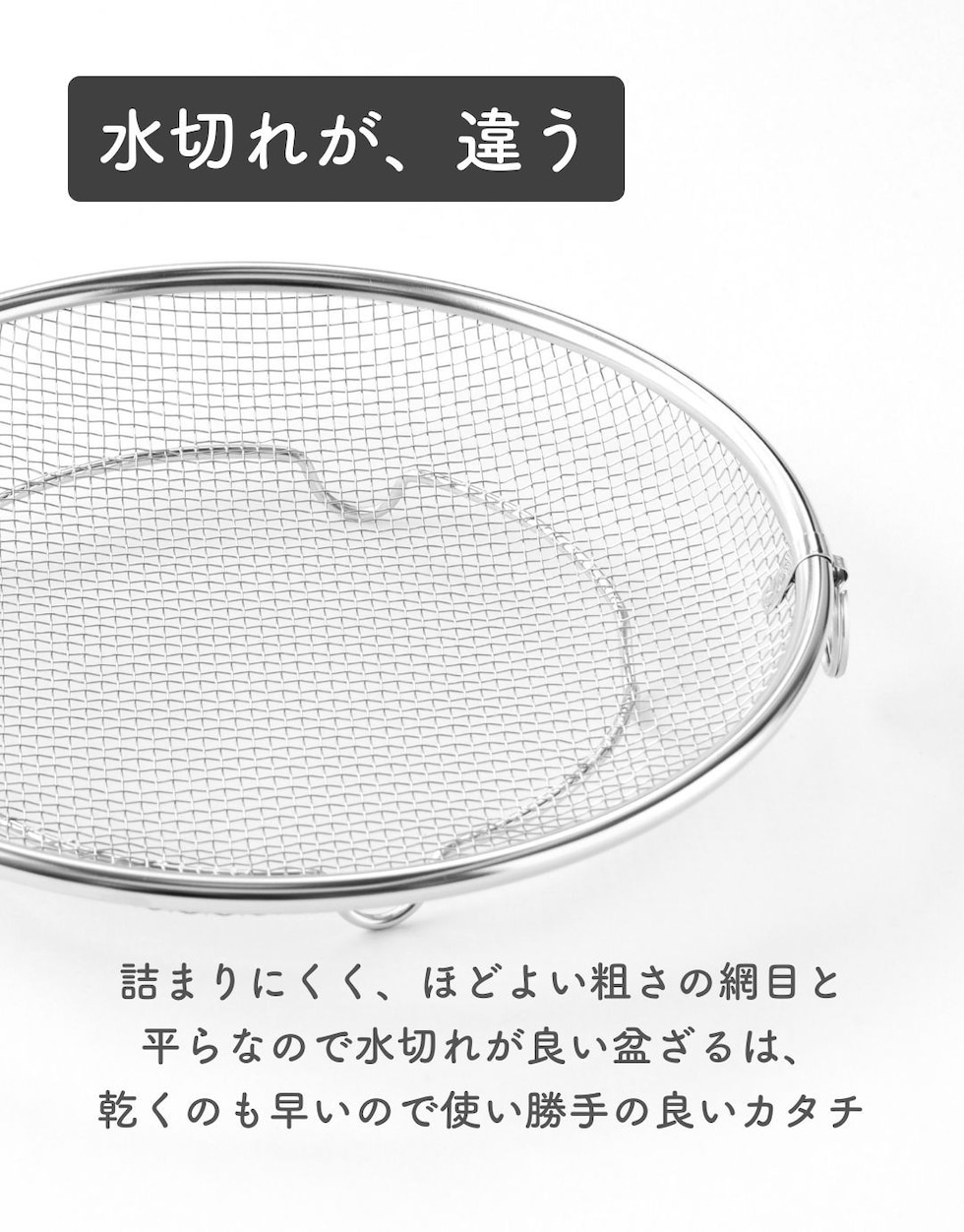 | 商品説明 | ●使う時だけ取っ手を装着する浅型のステンレス製のザル ●便利な持ち上げフック付きで、直接触れずに移動可能 ●取っ手がないから、鍋やフライパンの容量を目いっぱい使える便利設計 ●揚げ物の油切りとしても活躍 ●そのままお皿の中でも収まりが良いので、お皿に移動して食器としてもOK ●シリーズの水切りカゴよりも脚の高さを5mm上げているので、底面が接地しづらく蒸し料理にも最適 ●しっかり振って水切りしたい時も安定する、両サイドリング付き ●吊り下げ収納可能 ●ステンレス製だから、食洗機で丸洗い可能 |
