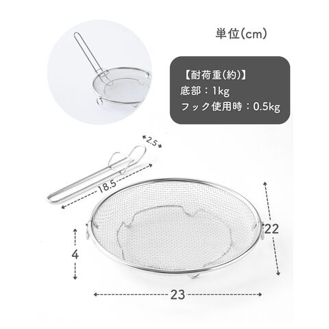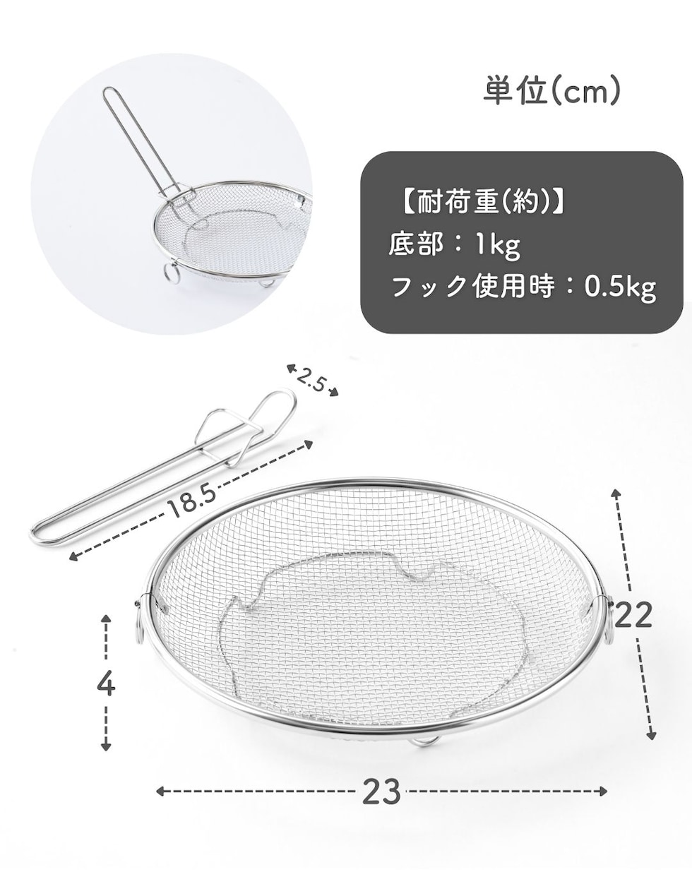 | 商品説明 | ●使う時だけ取っ手を装着する浅型のステンレス製のザル ●便利な持ち上げフック付きで、直接触れずに移動可能 ●取っ手がないから、鍋やフライパンの容量を目いっぱい使える便利設計 ●揚げ物の油切りとしても活躍 ●そのままお皿の中でも収まりが良いので、お皿に移動して食器としてもOK ●シリーズの水切りカゴよりも脚の高さを5mm上げているので、底面が接地しづらく蒸し料理にも最適 ●しっかり振って水切りしたい時も安定する、両サイドリング付き ●吊り下げ収納可能 ●ステンレス製だから、食洗機で丸洗い可能 |