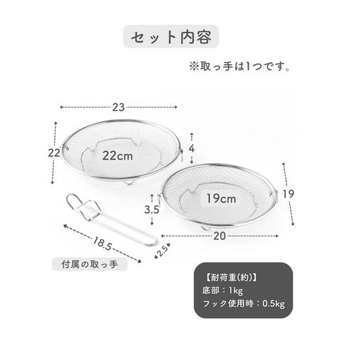 | 商品説明 | ●【セット内容】取っ手×1、ザル小×1、ザル大×1 ●使う時だけ取っ手を装着する浅型のステンレス製のザル ●便利な持ち上げフック付きで、直接触れずに移動可能 ●取っ手がないから、鍋やフライパンの容量を目いっぱい使える便利設計 ●揚げ物の油切りとしても活躍 ●そのままお皿の中でも収まりが良いので、お皿に移動して食器としてもOK ●シリーズの水切りカゴよりも脚の高さを5mm上げているので、底面が接地しづらく蒸し料理にも最適 ●しっかり振って水切りしたい時も安定する、両サイドリング付き ●吊り下げ収納可能 ●ステンレス製だから、食洗機で丸洗い可能 |