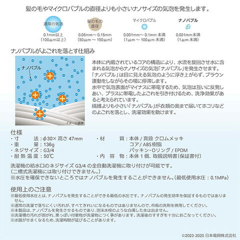 | 日本電興 NIHONDENKO ナノバブル発生キット 日本製 全自動洗濯機用 ND-SEZS シンプル 洗浄力アップ ネジサイズG3/4 簡単取付 臭い軽減効果 ND-SEZS |