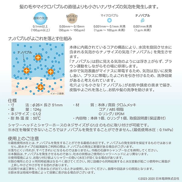 ナノバブル発生キット 日本製 シャワーヘッド用 ND-SESH ネジサイズ G1/2 洗浄力アップ 毛穴汚れ 節水 ND-SESH ナノバブル シャワー 取付簡単 節水 毛穴 洗浄 皮脂 よごれ 保温 保湿 乾燥 日本電興 NIHONDENKO 【送料無料】