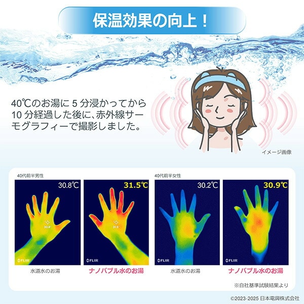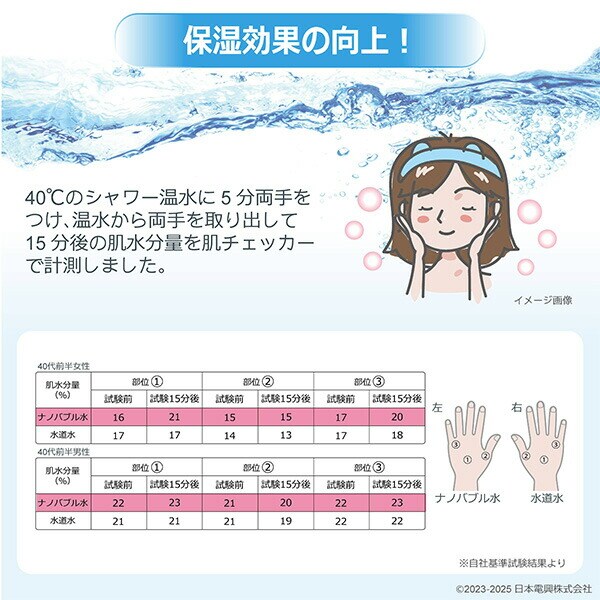 | 商品説明 | ●●シャワーヘッドと接続ホースの間に簡単接続 ※シャワーヘッドのネジサイズがG1/2のものに取付可能 ●取付可:TOTO、LIXIL(INAX)、SANEI、KAKUDAI、Yuko、水生活製作所、ミズタニ、スギヤマ、タカギ、GROHE、Hansgroheなど ●取付不可:MYM(W23山14)、KVK(M22×2)、その他輸入品のシャワーホース、ガスター、バランス釜、シャワーヘッド一体型ホース、台所用瞬間湯沸かし器など ●微細な大量の泡が毛穴に入り込み皮脂やよごれを落とす ●ナノバブル水が保温力や保湿力を向上させ肌の乾燥・湯冷めの改善を促す ●約15%の節水効果 ※自社基準試験:動水圧0.05MPa設定時の比較により ●最低使用水圧:0.1MPa ●耐熱温度:50℃ ●コア意匠登録:第1654446号 ●コア特許取得:特許第7042013号 ●ナノバブル発生数:平均粒径94.5nm 最頻度粒径56.6nm 約8500万個/ml発生 ●保証期間:1年間 ●内容:Oリングx1個、取り扱い説明書、保証書 |