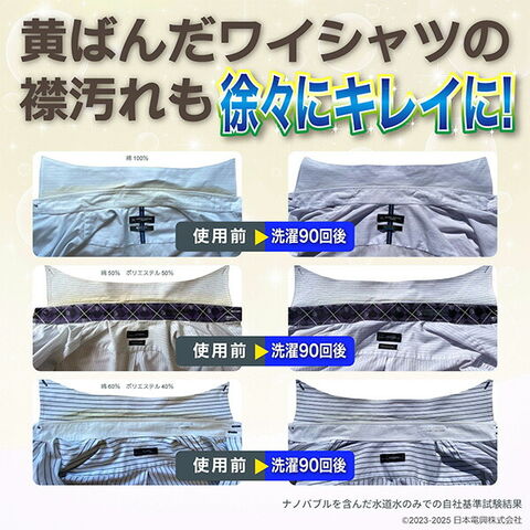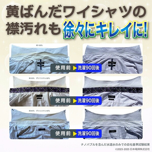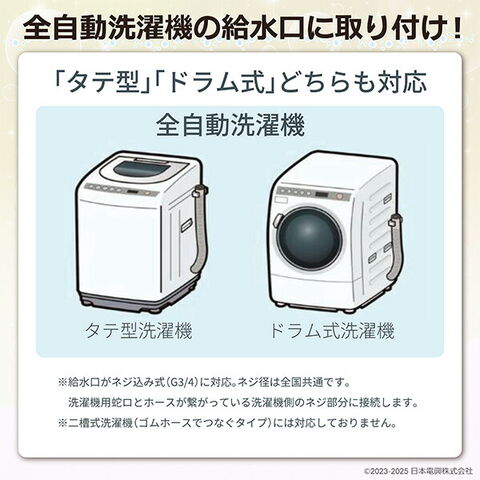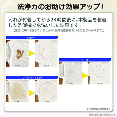 | 商品説明 | ●●タテ型・ドラム式どちらにも取付可能 ※給水口のネジサイズがG3/4のものに取付可能、ニ槽式洗濯機にはご使用いただけません。 ●お使いの全自動洗濯機と給水ホースの間に簡単接続! ●微細な大量の泡が繊維の奥まで洗浄し汚れをキレイに落とす ●Yシャツの黄ばみなども洗うたびに徐々にキレイに! ●洗濯槽の裏側の汚れやヌメリ・黒カビなどを洗濯するたびに徐々に洗い落とす ●最低使用水圧:0.1MPa ●耐熱温度:50度 ●ネジサイズ:G3/4 ●コア意匠登録:第1654446号 ●コア特許取得:特許第7042013号 ●平均粒径94.5nm、最頻度粒径56.6nm 約8500万個/ml発生 ●保証期間:1年間 ●内容:取り扱い説明書・保証書 |