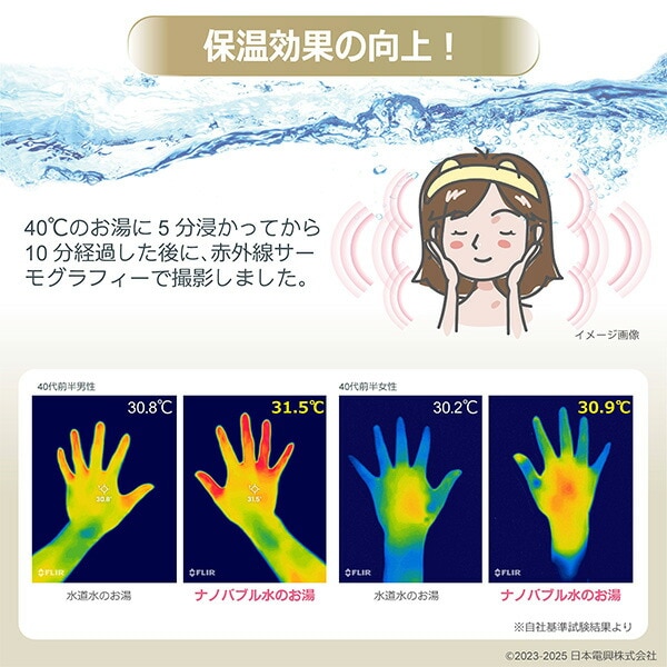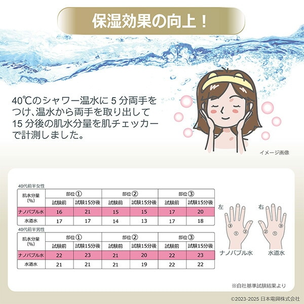 | 商品説明 | ●●シャワーヘッドと接続ホースの間に簡単接続 ※シャワーヘッドのネジサイズがG1/2のものに取付可能 ●取付可:TOTO、LIXIL(INAX)、SANEI、KAKUDAI、Yuko、水生活製作所、ミズタニ、スギヤマ、タカギ、GROHE、Hansgroheなど ●取付不可:MYM(W23山14)、KVK(M22×2)、その他輸入品のシャワーホース、ガスター、バランス釜、シャワーヘッド一体型ホース、台所用瞬間湯沸かし器など ●微細な大量の泡が毛穴に入り込み皮脂やよごれを落とす ●ナノバブル水が保温力や保湿力を向上させ肌の乾燥・湯冷めの改善を促す ●約15%の節水効果 ※自社基準試験:動水圧0.05MPa設定時の比較により ●最低使用水圧:0.1MPa ●耐熱温度:50℃ ●コア意匠登録:第1654446号 ●コア特許取得:特許第7042013号 ●ナノバブル発生数:平均粒径94.5nm 最頻度粒径56.6nm 約8500万個/ml発生 ●保証期間:1年間 ●内容:Oリングx1個、取り扱い説明書、保証書 |