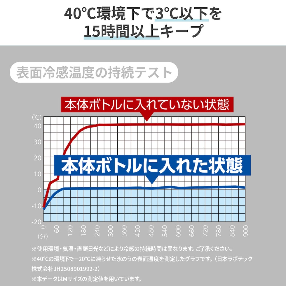 ●40℃の環境加下で3℃以下を15時間以上キープ(※使用環境・気温・体温・直射日光などにより結果は異なります)