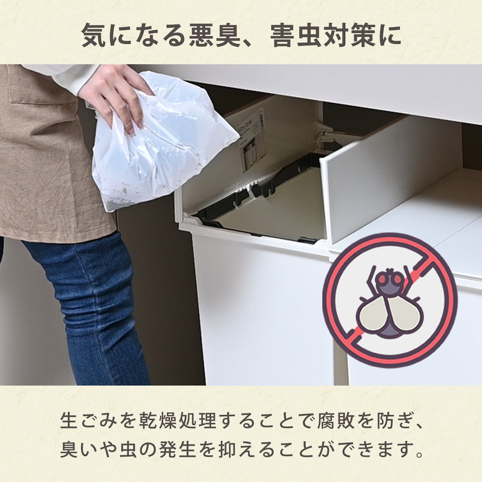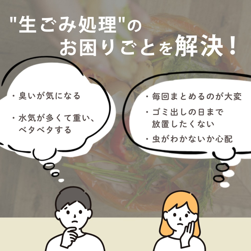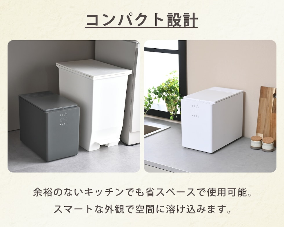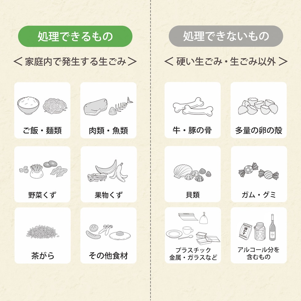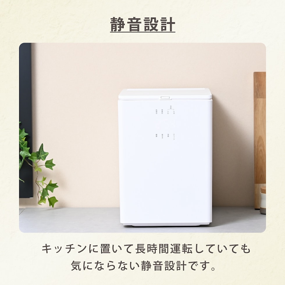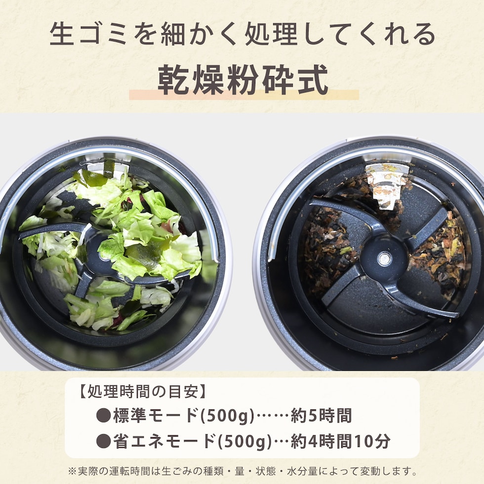 | 商品説明 | ●電源:AC100V(50/60Hz) ●消費電力:500W ●電源コード長:約1.6m ●容量:約2.6L ●処理時間(500g):標準モード/約5時間、省エネモード/約4時間10分 ●乾燥粉砕式で生ゴミを細かく処理 ●取り外せるパーツが多いのでお手入れ簡単 ●静音設計 ●コンパクトデザインでキッチンスペースに設置可能 ●三角コーナーのような使い方も可能 ●消臭カートリッジ交換目安:累積運転約500時間 ●メーカー保証:1年間 |