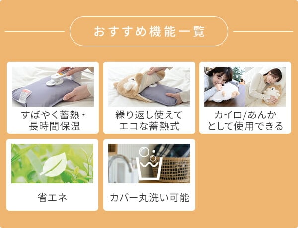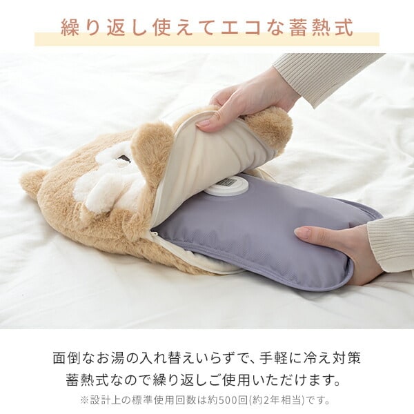 | 商品説明 | ●電源:AC100V(50/60Hz) ●定格消費電力:400W ●蓄熱温度:約55℃ ●蓄熱時間:約7分(室温20℃の場合) ※蓄熱時間は周囲の環境温度によって異なります。 ●電気代目安(蓄熱1回あたり):約1.5円 ※電気料金目安単価31円/kWhを基に算出 ●連続使用時間:あんか目的(布団内で使用)約8時間/カイロ目的(体に当てて使用)約4時間 ※使用時間は周囲の環境温度によって異なります。 ●繰り返し使用:約500回(約2年) ●コード長さ:90cm ●安全装置:温度ヒューズ、通電遮断スイッチ、サーモスタット ●セット内容:湯たんぽ、保温カバー、蓄熱用電源コードセット、取扱説明書 ●冬のデスクワークを省エネでかわいくあたたかく |