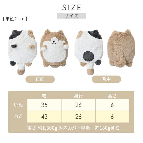 | 本体サイズ | グレージュ/ピンク/アイボリー:幅26.5×奥行19×高さ5cm 重さ1430g カバーサイズ 幅29×奥行23×高さ10cm イヌ:幅26.5×奥行19×高さ5cm 重さ1300g カバーサイズ 幅35×奥行26×高さ6cm ネコ:幅26.5×奥行19×高さ5cm 重さ1300g カバーサイズ 幅43×奥行26×高さ6cm |