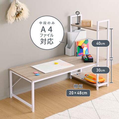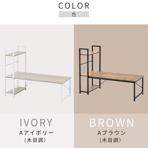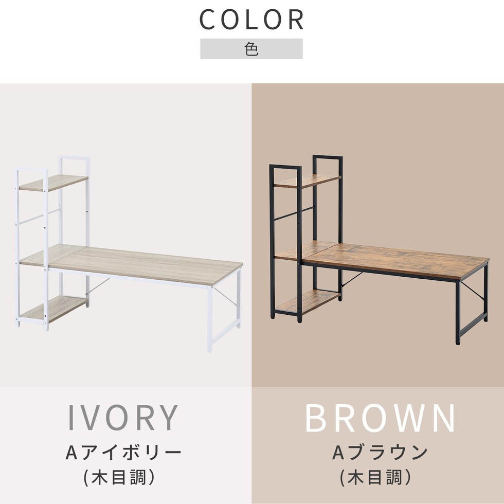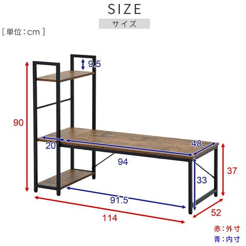 | 商品説明 | ●ラックと机が合体した一体型デスク ●ラック位置はお好みに合わせて左右選択可能 ●ラック中段はA4ファイルも収納可能 ●ラック棚板サイズ:幅20×奥行48cm ●天板サイズ:幅114×奥行48cm ●キズや水、汚れに強いメラミン樹脂天板採用 ●がたつきを軽減するアジャスター付き ●耐荷重:天板60kg、棚板各10kg、全体90kg |