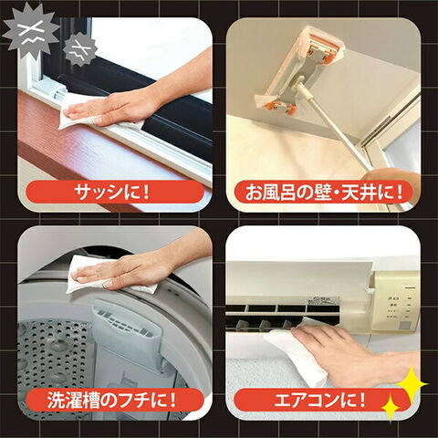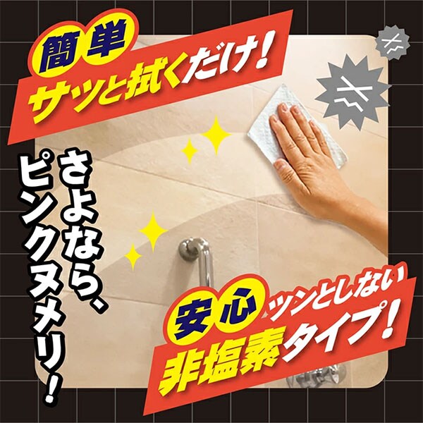 | 商品説明 | ●拭くだけで、洗浄&防カビ加工 ●大判厚手シート ●液性:弱アルカリ性 ●消臭&除菌効果あり ●防カビ加工約30日持続 ●ツンとしない非塩素タイプ ※塩素・漂白剤不使用のため、カビによる黒い色素汚れを白くする効果はありません ※すべての菌・臭いを除去するわけではありません |