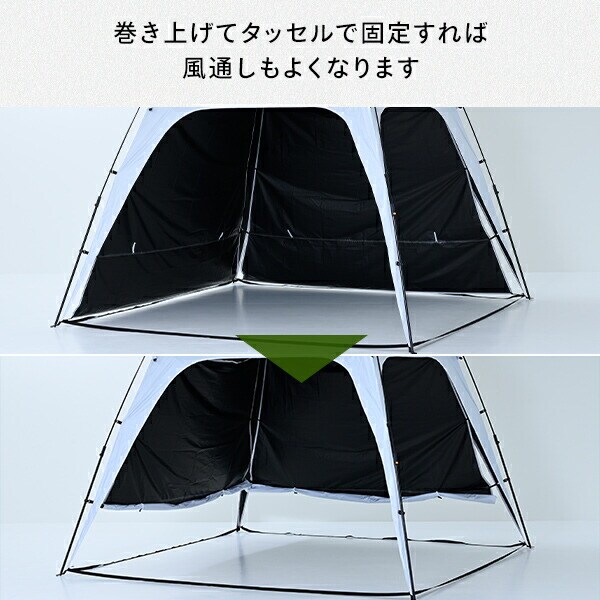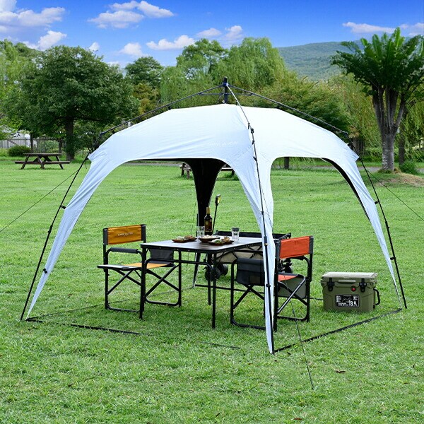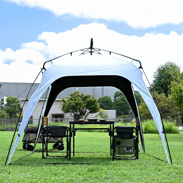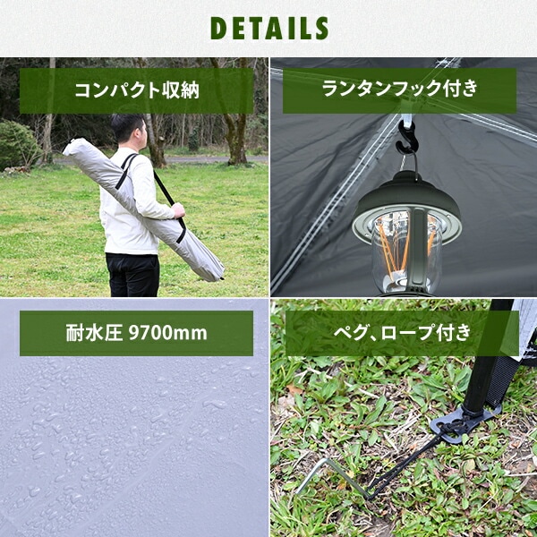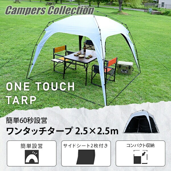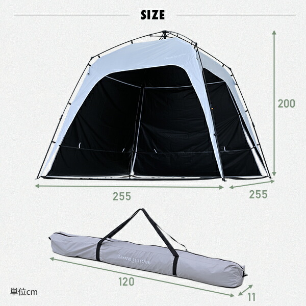 | 商品説明 | ●収納サイズ:直径11×長さ120cm ●セット内容:タープ本体、サイドシート、ペグ8本、ガイドロープ4本、キャリーバッグ ●簡単ワンタッチ60秒設営 ●255×255cmのゆったりサイズ ●高さが200cmあるので立っても圧迫感がありません ●サイドシート2枚付き ●UPF 50+ ●遮蔽率:99.99% ●遮光率:99.99% ●耐水圧:9,700mm |
