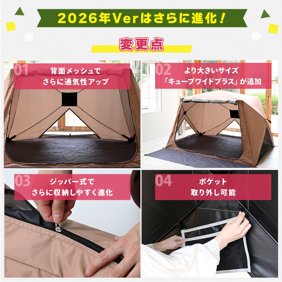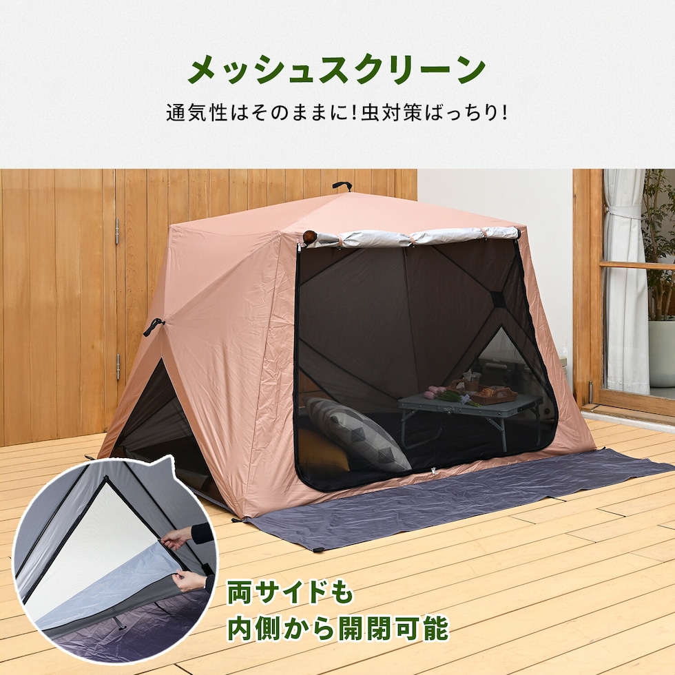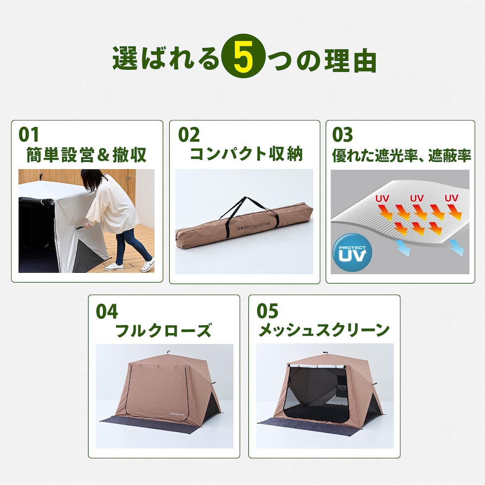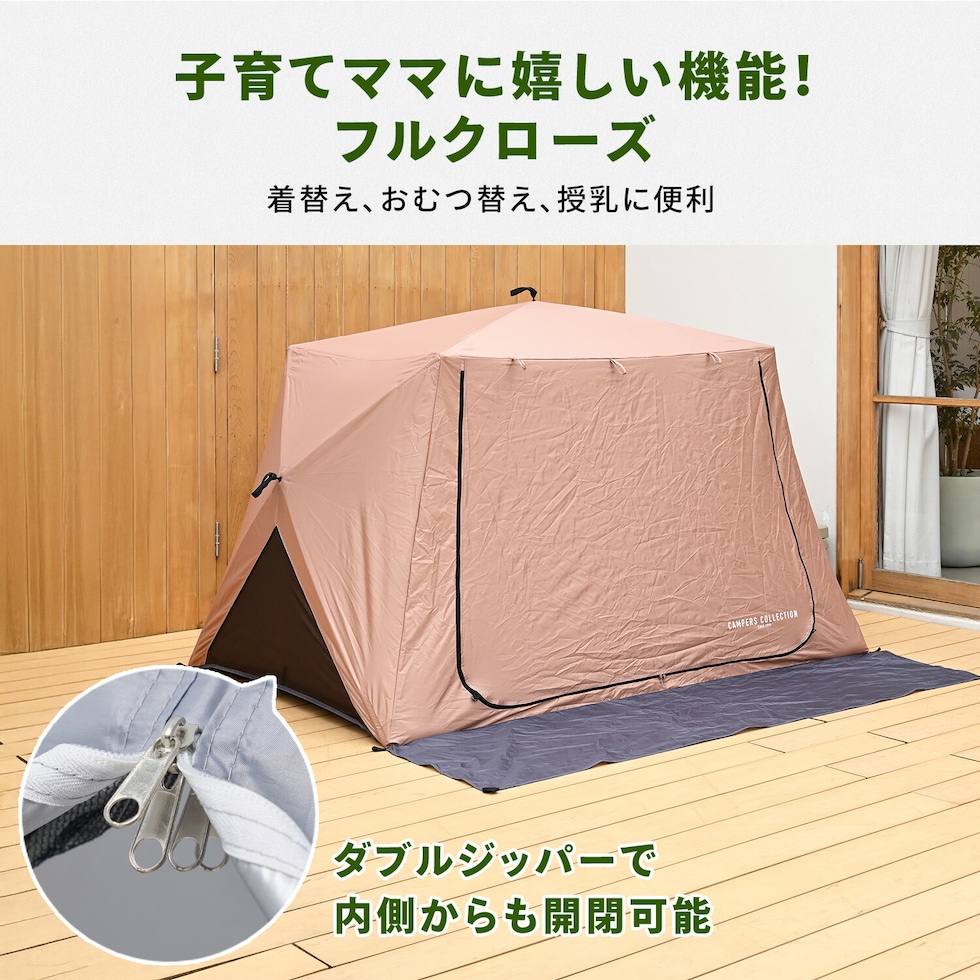 | 商品説明 | ●意匠登録済 ●実用新案登録済 ※本製品の類似品・模倣品の販売は法律により禁止されております。類似品・模倣品を発見した場合は法的処置を取らせていただきます。 ●10秒設営、10秒撤収 ※設営:組み立て時間、撤収:たたむまで ●UV遮蔽率:98.9% ●遮光率:98.77% ●耐水圧:2920ml ●フルクローズ機能で着替えもできる ●メッシュ機能で虫を寄せ付けずに風通しできます ●棒状にコンパクト収納されるので持ち運びがラクラク ●両面ファスナーで内側からも開閉可能 ●独立フロントシート ●取り外し可能なポケット付きでスマホやタオルの収納に! ●付属品:ペグ11本、ガイドロープ5本、キャリーバッグ ●テント折りたたみ時サイズ:幅18×奥行15.5×長さ123cm |