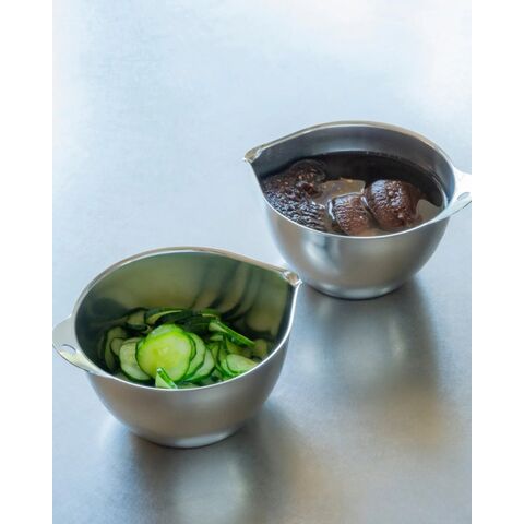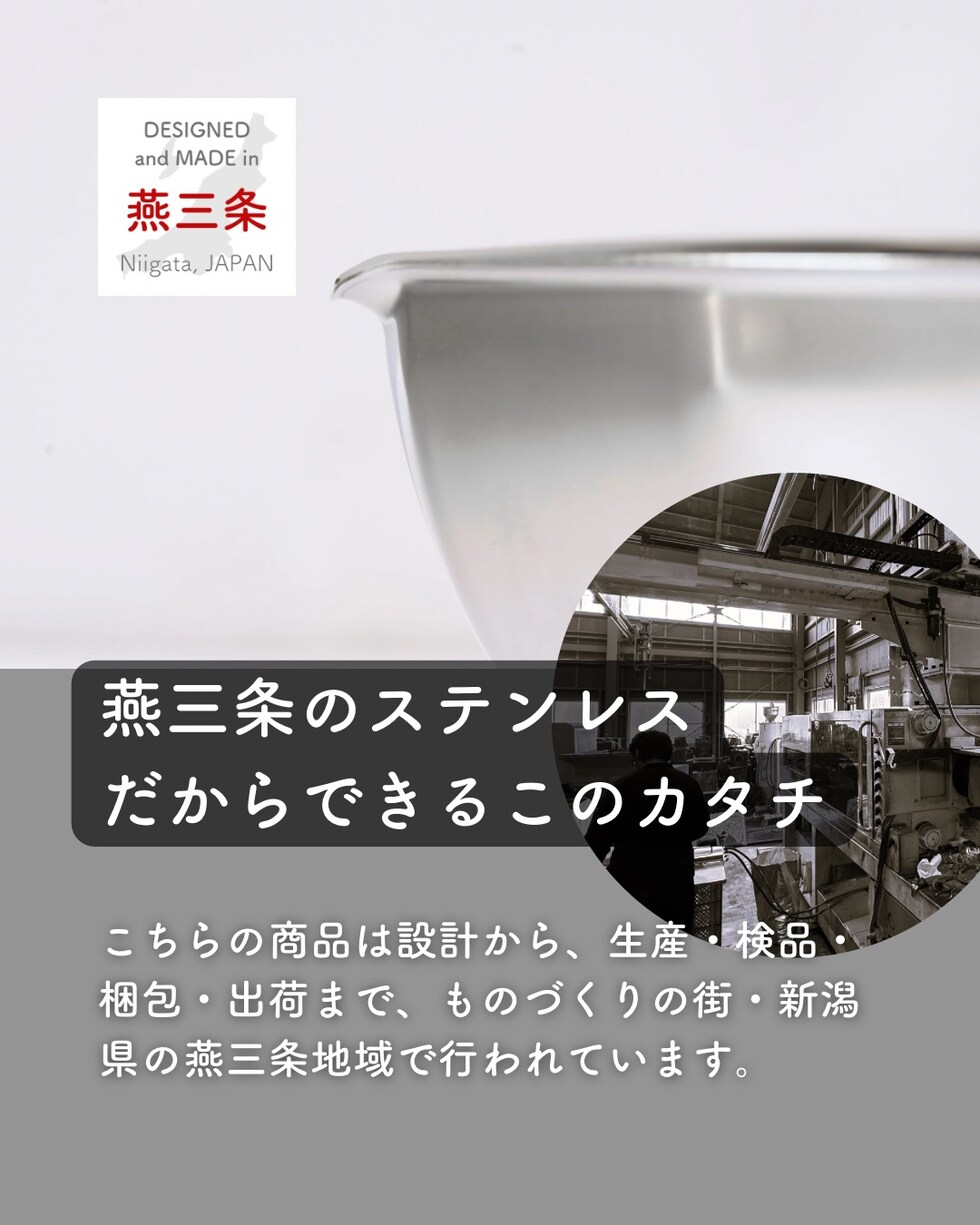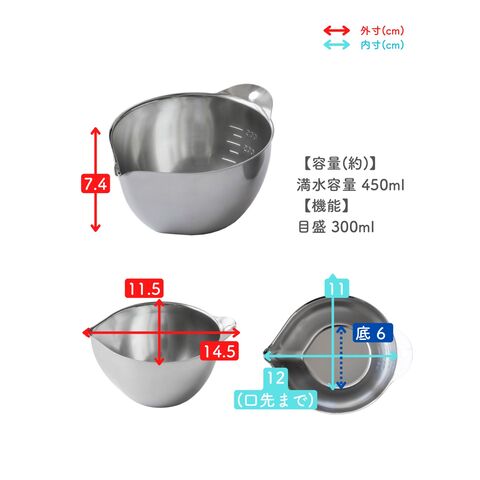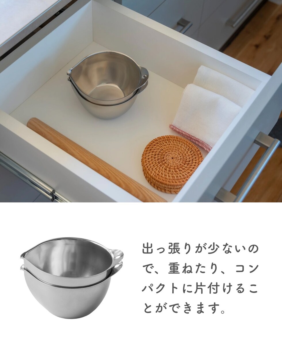 | 商品説明 | ●液体が垂れずにピタッと止まる、ステンレス製のボウル ●卵焼きや合わせ調味料、下ごしらえにぴったり ●液だれしにくい、特殊な2段階の注ぎ口 ●円型ではなく液体を注ぎ口に集中させ、液体が一気に出るのを防ぎスムーズになる、しずく型の底面 ●持ちやすさにこだわった緩やかなカーブの淵 ●穴があることで親指がフィットしてボウルをしっかり支え、引っ掛け収納にも対応 ●内側には、50ml単位で300mlまでの目盛り付き ●外側はラップがぴたっと密着する、なめらかな光沢仕上げ ●実用容量 300ml、満水容量 約450ml |