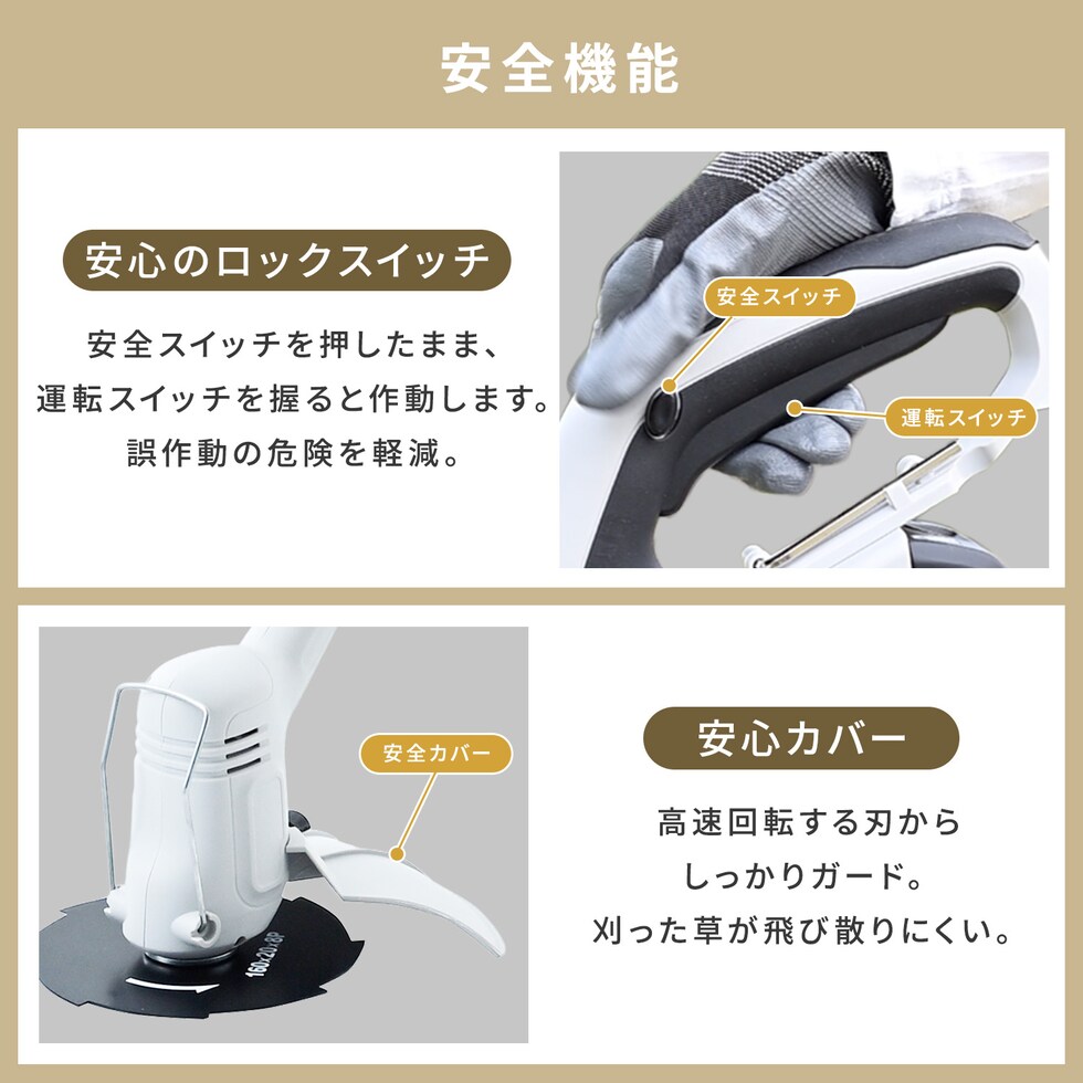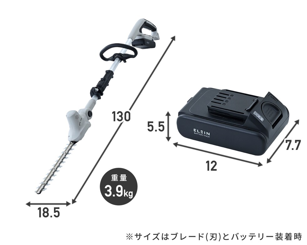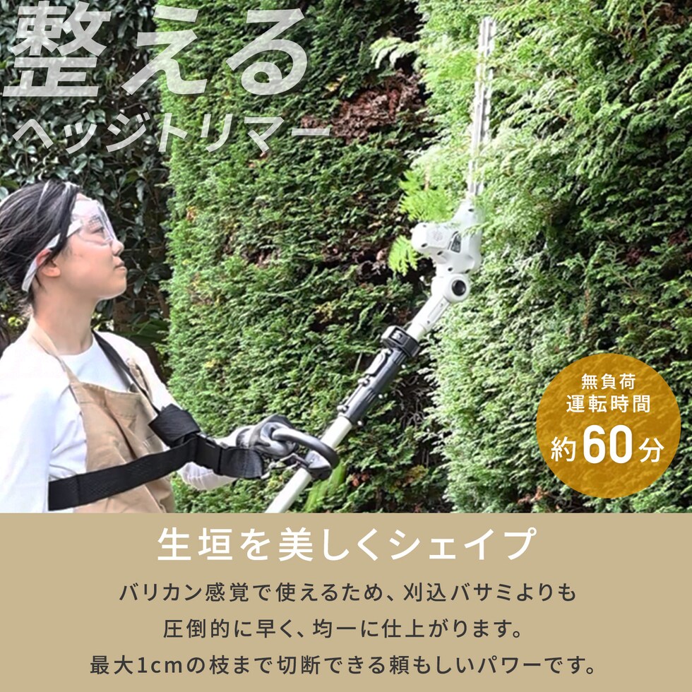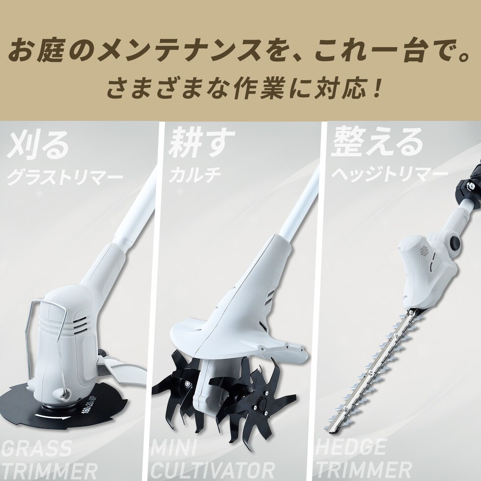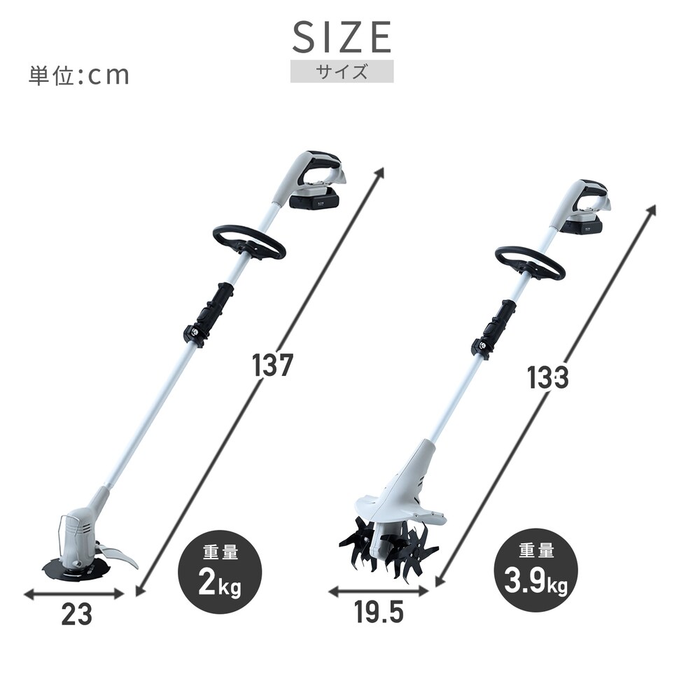 | 本体サイズ | ・グラストリマー:幅137×奥行22×高さ23cm 重量2kg ・カルチベーター:幅133×奥行13.2×高さ19.5cm 重量3.9kg ・ヘッジトリマー:幅130×奥行21×高さ18.5cm 重量1.8kg ※サイズはブレード(刃)とバッテリー装着時 |