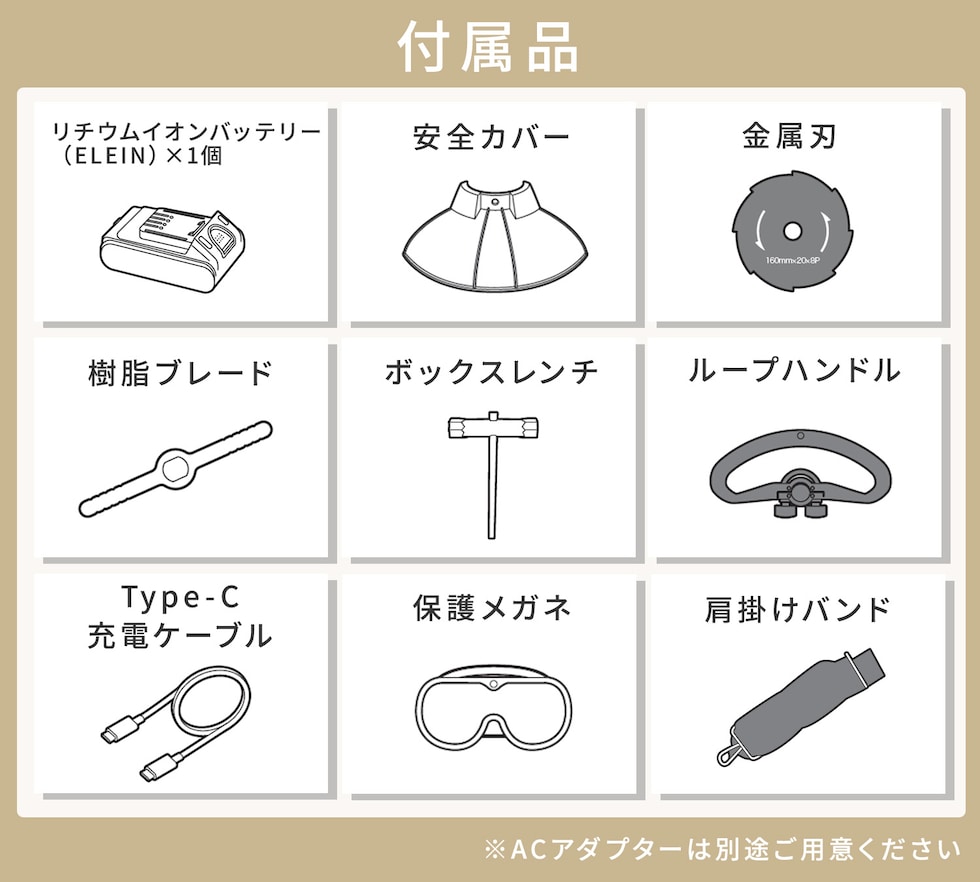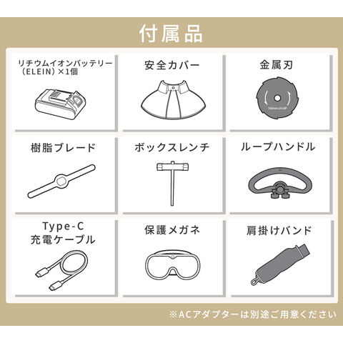 | 商品説明 | ●コードレス仕様のためどこでも使用可能 ●電気式だからエンジン式より静かで排気量も出ない ●ブラシレスモーターによる力強く安定した回転で、作業がより快適 初心者でも使いやすい ●先端を変えるだけで1台3役! 【カルチベーター(耕運機)】 ・耕幅:約200mm ・深さ:約80mm ・回転数:約280min-1 ・無負荷作業時間:約45分 【グラストリマー(草刈り機)】 ・草刈幅:約160mm ・刃:金属刃、樹脂刃 ・回転数:約6000min-1 ・無負荷作業時間:約60分 【ヘッジトリマー(芝刈り機)】 ・刈込幅:約300mm ・ストローク数:約1300min-1 ・最大切断径:約10mm ・無負荷作業時間:約60分 《リチウムイオンバッテリー》 ※GC-1825・GCH-1825共通 ・定格:DC18V 2.5Ah 45Wh ・充電時間:約120分(20W以上の場合) ・充電入力:USB Type-C 5V/2.4A、9V/3A、12V/3A、15V/3A(最大45W) ・リチウムイオンバッテリー(ELEIN)×1個、チップソー、ボックスレンチ、六角棒レンチ、保護メガネ、肩掛けバンド、Type-C充電ケーブル、取扱説明書 |