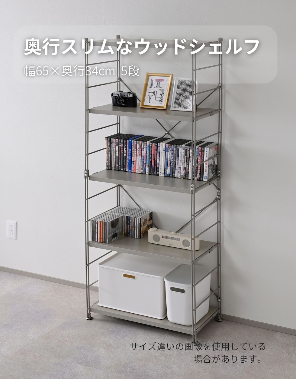 | 商品説明 | ●●プラスドライバーをご用意ください。 ※重量もあるため、お二人以上での組み立てをおすすめいたします。 ※本体外寸の「幅」は、足元のアジャスターの外側~外側の寸法になります。 ●モノに合わせて棚の位置を変えられる木製棚板のスチールラック ●インボックスなど収納ボックスが収まるサイズ設計 ●棚板は木の質感があってお手入れもかんたんな、メラミン樹脂塗装 ●お部屋のインテリアを邪魔しないグレージュとチャコールグレーの2色 ●奥行34cmで狭い場所でもスリムでたくさん収納可能 ●圧迫感のないオープンな収納ラック ●フックでフレームに引っ掛けるだけなので、位置の変更もかんたん ●棚板を追加したり複数揃えると、フラットに横連結可能 ●脚部には、ガタつきを抑えるアジャスター付き ●耐荷重: 1段あたり25kg、全体125kg ●可動式棚板5枚(板の厚さ2.5cm、約12.5cm間隔、13段階高さ調節) ●(最下段時)棚板下5.4cm ●棚板サイズ: 幅59.5 奥行30cm |