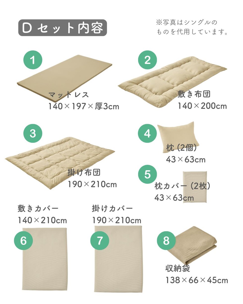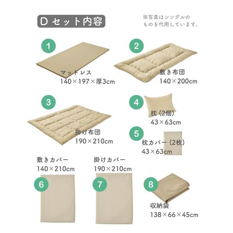 | 本体サイズ | 【マットレス】 幅140×奥197×高3cm 重量5kg 【掛け布団】 幅190×奥210cm 中綿量1.7kg 【敷き布団】 幅140×奥200cm 中綿量3.3kg 【まくら】 幅43×奥63cm 中綿量0.5kg 【掛け布団カバー】 幅190×奥210cm 【敷き布団カバー】 幅140×奥200cm 【まくらカバー】 幅43×奥63cm 【収納袋】 幅138×奥66×高45cm 重量0.5kg |