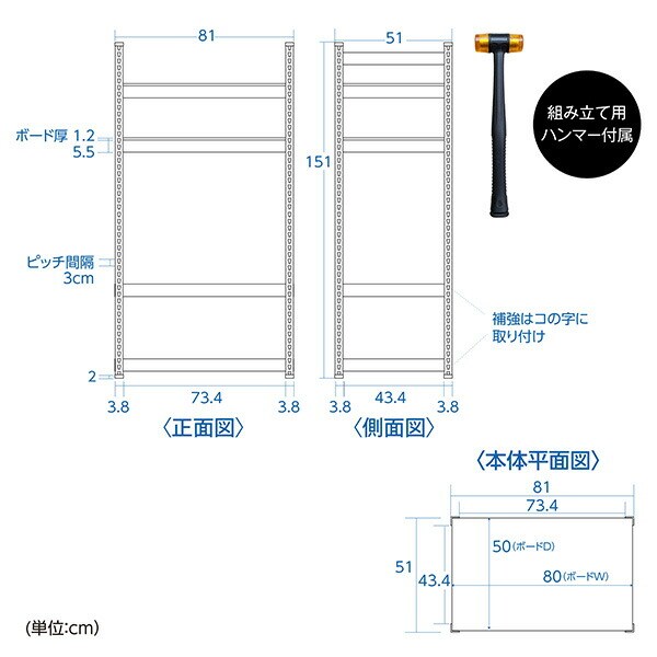 | 本体サイズ | 幅81×奥行51×高さ151cm 重量15kg ボード:幅80×奥行50cm |