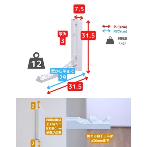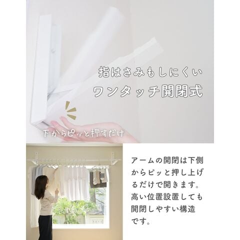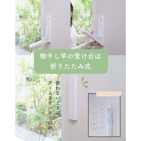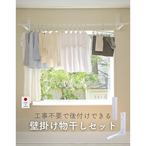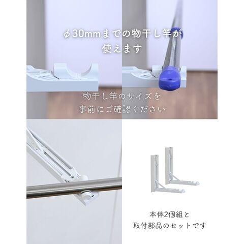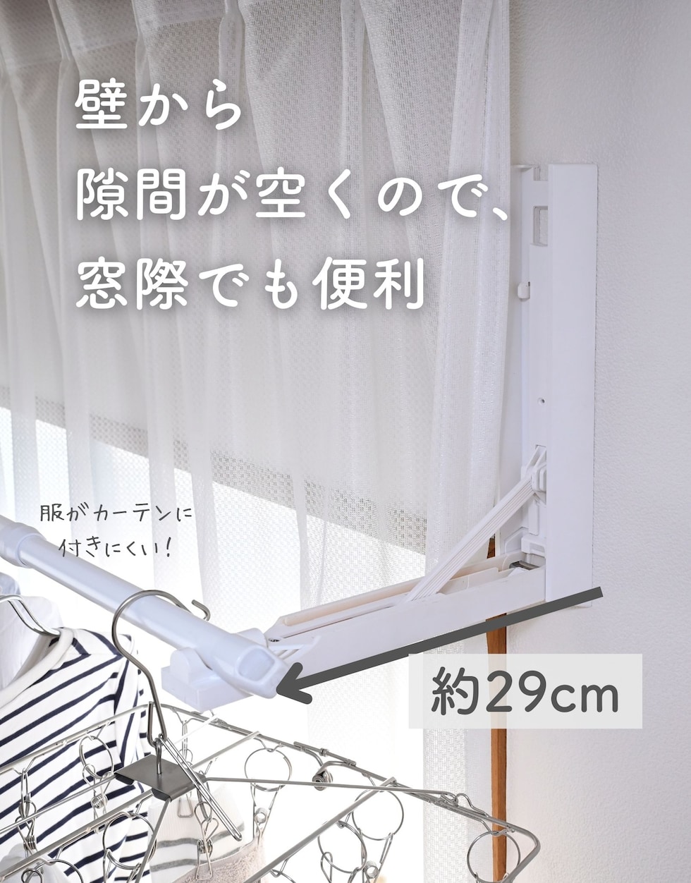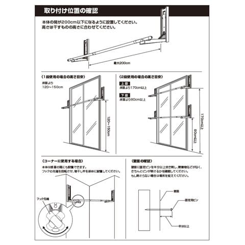 | 商品説明 | ●※物干し竿は付属していません ※本製品付属のピンは、石膏ボード専用です。 ※安全荷重値として12kgが目安となります。 【セット内容】 本体(台座)2個、取り付け用ピン60本(予備含む)、取り付け工具1本、取り付け用メジャー(1m)4本 ●壁を使って工事不要で物干しスペースが増やせる本体(台座)の2個のセット ●物干しラックを床置きせず、壁を使って浮かせて部屋干し可能 ●普段使わない時はアームをたたんですっきり収納、インテリアを邪魔しない薄くてシンプルな外観 【賃貸でも使える、石膏ボード用ピンを採用】 ●取り付け穴が目立ちにくい細くて小さなピンを使用しているので、壁の傷を抑えて設置可能 ●本体や付属のピン、工具などもすべて安心の日本製 ●付属石膏ボード用ピン:胴直径1×長さ20mm、頭部直径2mm、ステンレス製 【すっきり片付く折りたたみアーム】 ●展開時の壁から竿までの距離約29cm、壁やカーテンに洗濯物が干渉しにくいアーム構造 ●アームは指はさみもしにくい、ワンタッチ開閉式 ●開くときは、台座下部を下から浮かせるだけでOK ●閉じるときも、台座をそのままたたむだけでラクラク ●アームの先端は左右60度ずつ可動し竿を斜めに掛けることも可能 ●部屋の隅や狭い場所の角を物干しスペースとして有効活用 【詳細】 ●耐荷重: 12kg ●最大取り付けサイズ: 土台と土台の間 200cm ●壁から竿受けまでの距離: 約29cm ●推奨物干し竿サイズ: 直径22~30mmの物干し竿、ポール 【取り付け・取り外しについて】 ・設置目安: 約60分 ・本体(アーム台座)の上下に2cm、左右に5mm、障害物がない場所に設置ください。 ・本体の間が横幅200cm以下になるよう設置ください。 ・台を設置するために、合計38本のピンを差します。 ・付属の工具で作業はシンプルですが、ピンを押し込むのに力が必要です。 ・取り付けは付属の工具だけでできますが、取り外しの際は、別途お客様にてマイナスドライバーとラジオペンチをご用意いただく必要がございます。 ※一般家庭の石膏ボード壁用製品です。 ※土壁や漆喰などのもろい壁や、コンクリートやべニア板などの硬い壁には設置できません。 ※板壁、コンクリート壁に取り付ける場合には、別途お客様にて木ネジやアンカーをご用意いただく必要がございます。(ビスなどのサイズ目安: 木ネジ: 皿ネジ、直径4×長さ40mm・計6本、アンカー: 直径4mm・計6本) |