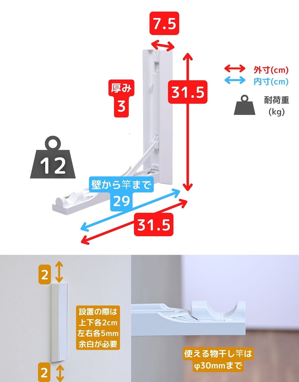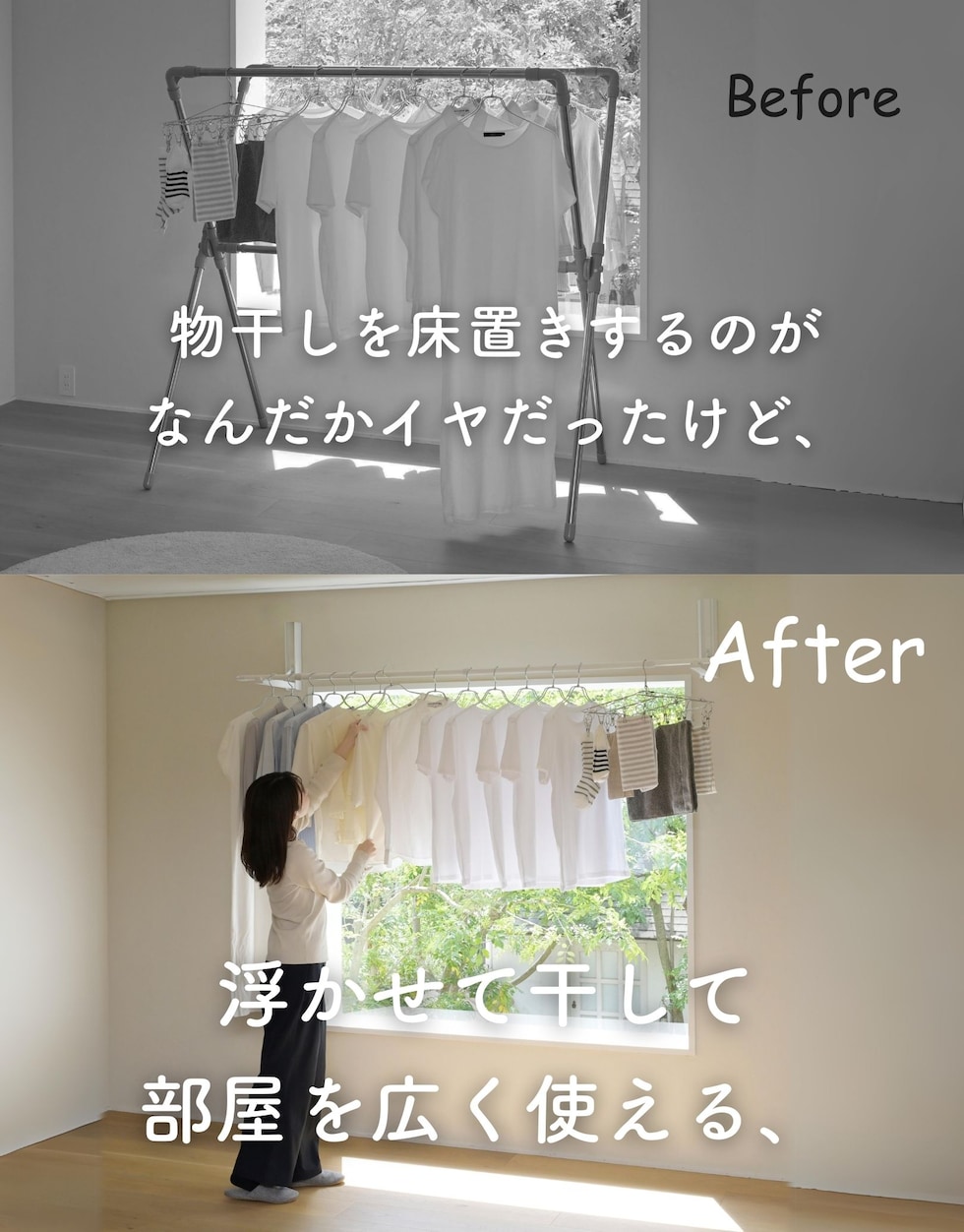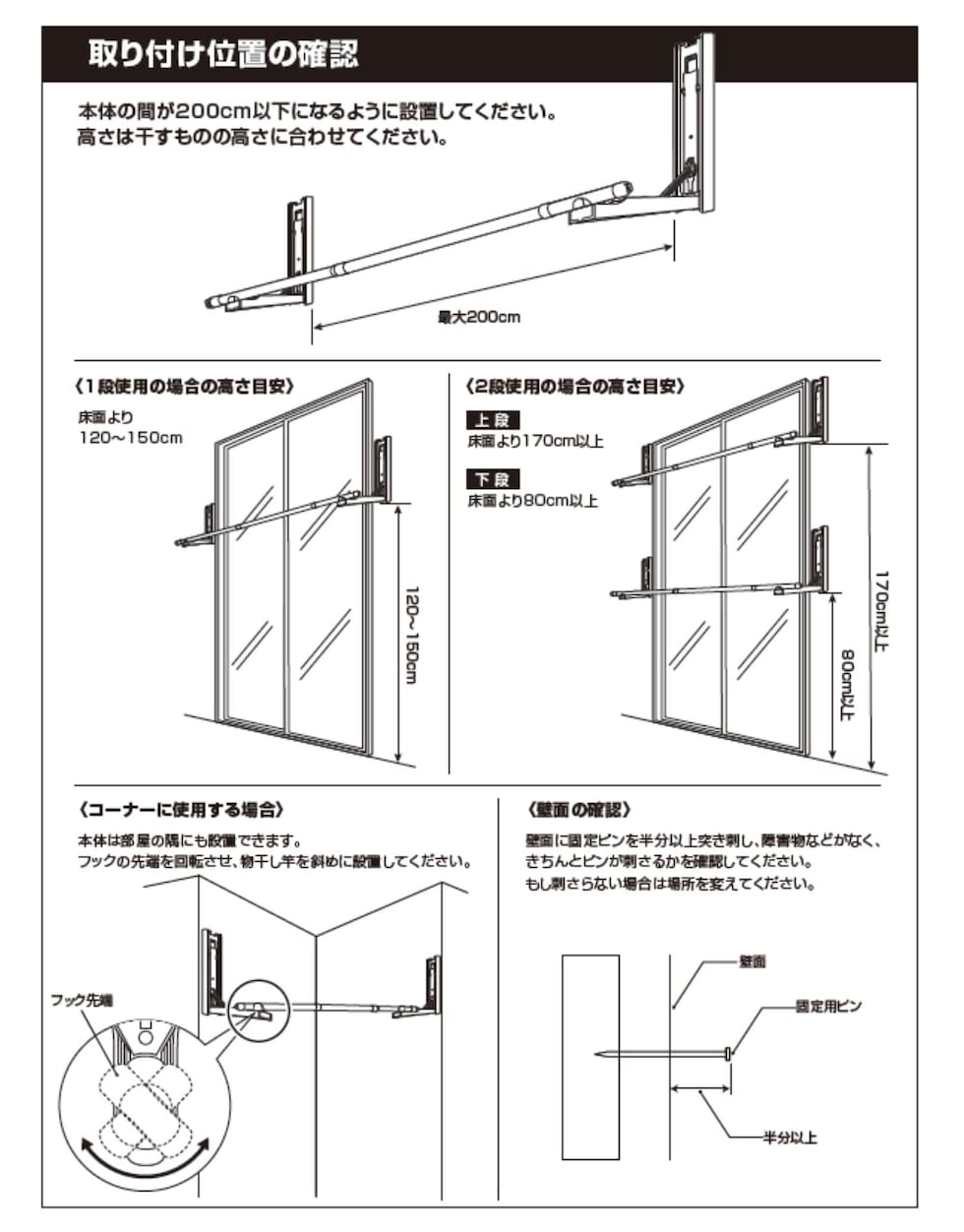 | 商品説明 | ●※物干し竿は付属していません ※本製品付属のピンは、石膏ボード専用です。 ※安全荷重値として12kgが目安となります。 【セット内容】 本体(台座)2個、取り付け用ピン60本(予備含む)、取り付け工具1本、取り付け用メジャー(1m)4本 ●壁を使って工事不要で物干しスペースが増やせる本体(台座)の2個のセット ●物干しラックを床置きせず、壁を使って浮かせて部屋干し可能 ●普段使わない時はアームをたたんですっきり収納、インテリアを邪魔しない薄くてシンプルな外観 【賃貸でも使える、石膏ボード用ピンを採用】 ●取り付け穴が目立ちにくい細くて小さなピンを使用しているので、壁の傷を抑えて設置可能 ●本体や付属のピン、工具などもすべて安心の日本製 ●付属石膏ボード用ピン:胴直径1×長さ20mm、頭部直径2mm、ステンレス製 【すっきり片付く折りたたみアーム】 ●展開時の壁から竿までの距離約29cm、壁やカーテンに洗濯物が干渉しにくいアーム構造 ●アームは指はさみもしにくい、ワンタッチ開閉式 ●開くときは、台座下部を下から浮かせるだけでOK ●閉じるときも、台座をそのままたたむだけでラクラク ●アームの先端は左右60度ずつ可動し竿を斜めに掛けることも可能 ●部屋の隅や狭い場所の角を物干しスペースとして有効活用 【詳細】 ●耐荷重: 12kg ●最大取り付けサイズ: 土台と土台の間 200cm ●壁から竿受けまでの距離: 約29cm ●推奨物干し竿サイズ: 直径22~30mmの物干し竿、ポール 【取り付け・取り外しについて】 ・設置目安: 約60分 ・本体(アーム台座)の上下に2cm、左右に5mm、障害物がない場所に設置ください。 ・本体の間が横幅200cm以下になるよう設置ください。 ・台を設置するために、合計38本のピンを差します。 ・付属の工具で作業はシンプルですが、ピンを押し込むのに力が必要です。 ・取り付けは付属の工具だけでできますが、取り外しの際は、別途お客様にてマイナスドライバーとラジオペンチをご用意いただく必要がございます。 ※一般家庭の石膏ボード壁用製品です。 ※土壁や漆喰などのもろい壁や、コンクリートやべニア板などの硬い壁には設置できません。 ※板壁、コンクリート壁に取り付ける場合には、別途お客様にて木ネジやアンカーをご用意いただく必要がございます。(ビスなどのサイズ目安: 木ネジ: 皿ネジ、直径4×長さ40mm・計6本、アンカー: 直径4mm・計6本) |