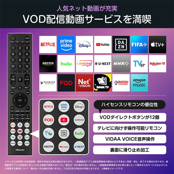 | 商品説明 | ●豊富な動画配信サービス対応モデル ●Apple Airplay2/Anyview Cast対応、Apple/Androidデバイスの画面をワイヤレスでスクリーンシェアできる ●ネット動画に特化した高画質処理機能を搭載するHI-VIEWエンジンR ●AIネット映像高画質処理 ●低遅延ゲームモード ●外付けHDD対応 ●裏番組録画対応 ●ネット動画サービス:Netflix/Amazon Prime Video/Disney+/Youtube/DAZN/FIFA+/AppleTV+/ABEMA/Hulu/Lemino/U-NEXT/NHK+/TVer/Rakuten TV/WOWOWオンデマンド/FOD/Net-VISION/DMMTV/SPOOX ●Bluetooth:イヤホン/ヘッドホン/サウンドバー ●チューナー:BS 4K/110度CS 4K×2、地上デジタル×2、BS/110度CSデジタル×2、CATVパススルー方式 ●付属品:取扱説明書、Bluetooth/赤外線リモコン(ERF3H46H)、単四形乾電池×2、 電源コード、 転倒防止ひも1式、スタンド1式、壁掛調整用六角ナット×2 ●メーカー保証3年 |
