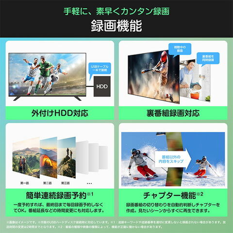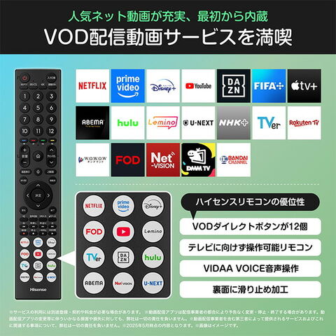| 商品説明 | ●画面サイズ:40V型 ●画素数:1920×1080 ●エンジン:HI-VIEWエンジン2K+ ●ネット動画アプリが最初から内蔵された快適OS ●ネット動画サービス:Netflix/Amazon Prime Video/Disney+/Youtube/DAZN/FIFA+/Apple TV+/ABEMA/Hulu/Lemino/U-NEXT/NHK+/TVer/Rakuten TV/WOWOWオンデマンド/FOD/Net-VISION/DMM TV/SPOOX ●Works with Alexa/Apple Home対応 ●Anyview Cast/Airplay2対応 ●Bluetooth搭載 ●3波Wチューナー内蔵 ●付属品:取扱説明書、Bluetooth/赤外線リモコン(ERF3C46H) 、単三形乾電池×2、転倒防止ひも1式、スタンド1式、miniB-casカード ●メーカー3年保証付 |