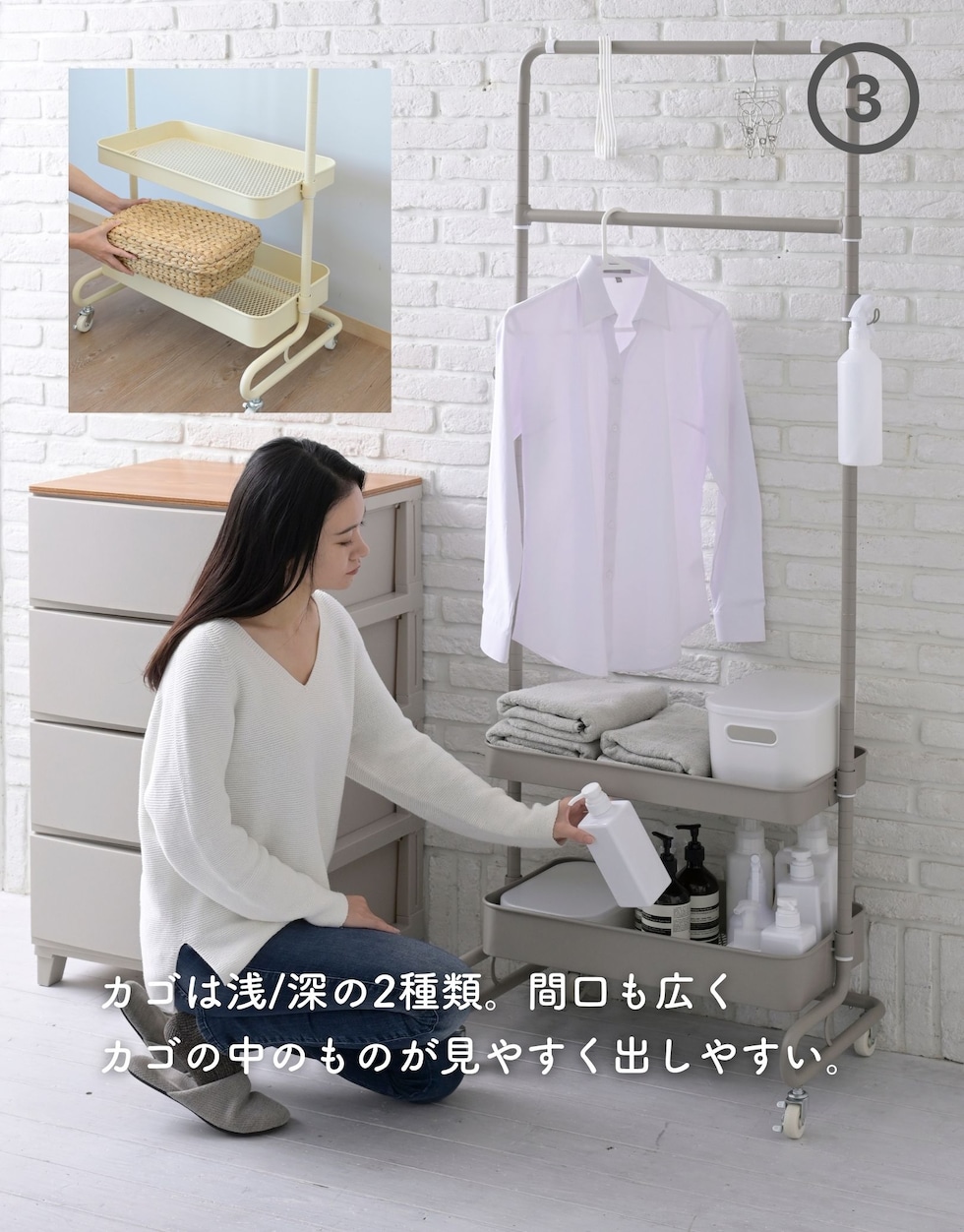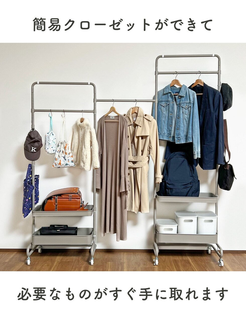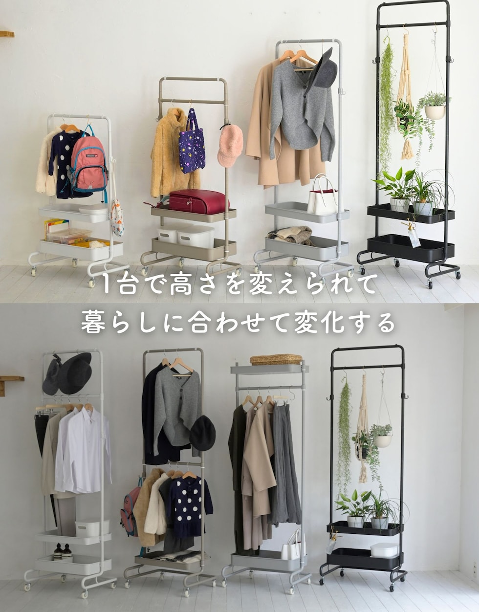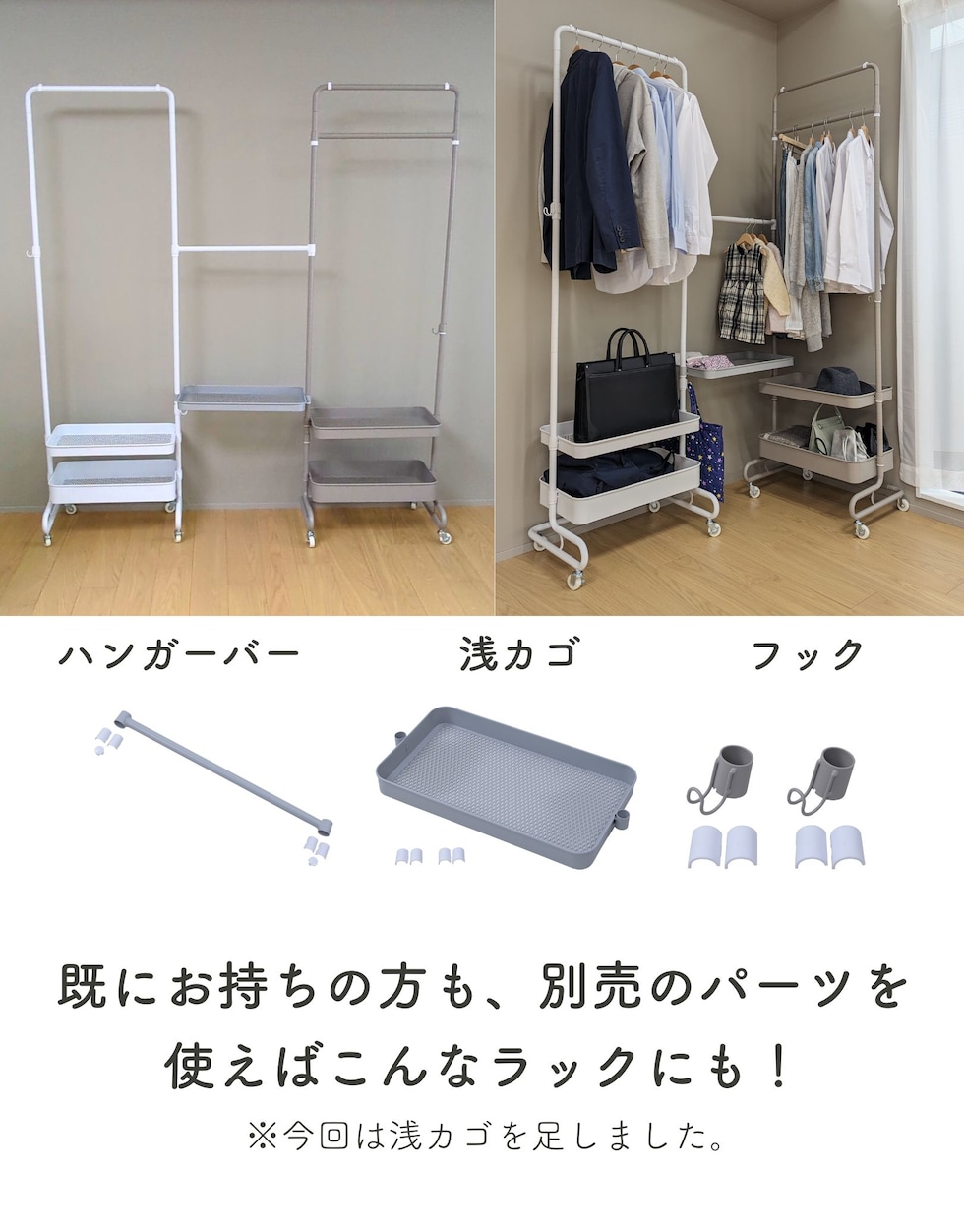 | 商品説明 | ●上着もカバンもひとまとめにできる、バスケット付きのハンガーラック ●本体同色2台+同色ハンガーバーのセット ●別々で使うことも、2台をハンガーバーでつないで使うことも可能 ●組み立てカンタン、耐荷重も安心、【実用新案】取得済みの独自構造 ●ハンガーバーを1本とサイドフック2個を追加し、カゴの一つを浅めに変更して、より多くの使い方ができる仕様にリニューアル ●本体高さを変えて色々な使い替えができる収納グッズ ●ワンピースやコートを掛けられる高さから、お子様も使いやすい高さまで設定可能 ●バスケットも、しまうモノに合わせて2.5cm間隔で高さ変更可能 ●バスケットの底は、ホコリのたまりにくい網状のメッシュ仕様 ●重量キャスターで、重いモノがのってもスイスイ移動 ●表面はツヤ消しでざらつきもあるマット仕上げ ●工具不要(スパナ付属) ●本体高さ4段階設定: 113.5/139/164.5/189cm ●バスケット内寸(最大値): 幅53 奥行29.5 深さ4/8cm ●フックを外向きにした際の最大幅: 66cm ●ハンガーバー内寸幅:(上)43.5 (下)53.5cm ●サイドフック: 外寸幅2cm、内寸奥行2.5 内寸深さ2cm、2.5cm間隔で高さ調節、着脱も可能 ●床から最下段高さ: 18.5cm ●耐荷重:バスケット1段あたり15kg、ハンガーバー1本あたり15kg |