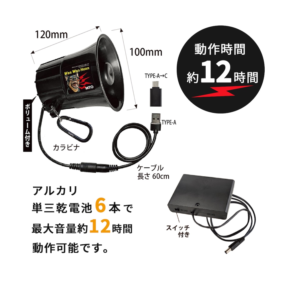 熊よけ わんわんホーン カラビナ 乾電池ケース付き 熊除けホーン 強力メガホン型 最大音量110db