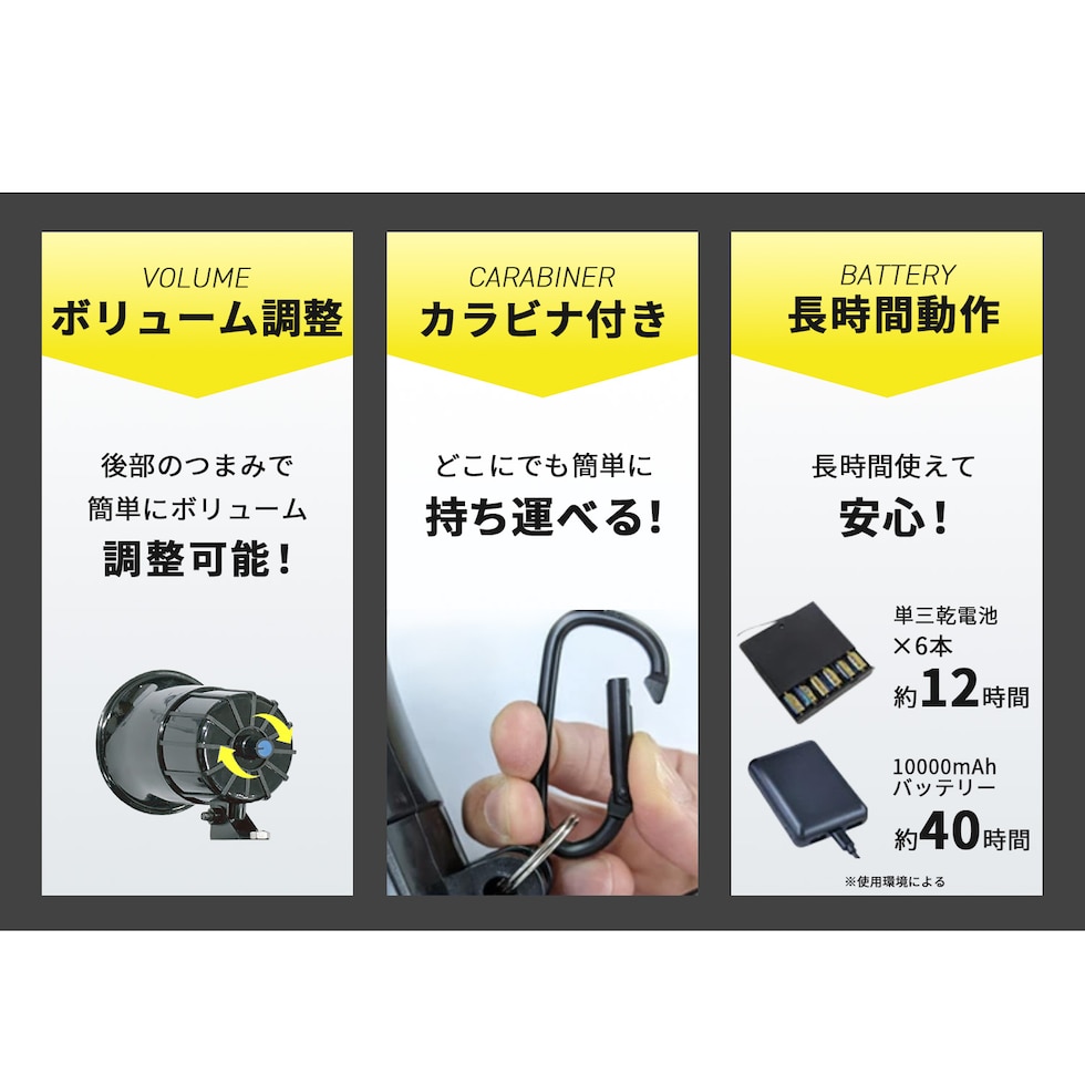 ●モバイルバッテリー5V~12V(別売り)の電源使用も可能。最大音量110dbで使用した場合、5000mAの小型タイプで約18~20時間連続作動、10000mAで約35~40時間連続作動