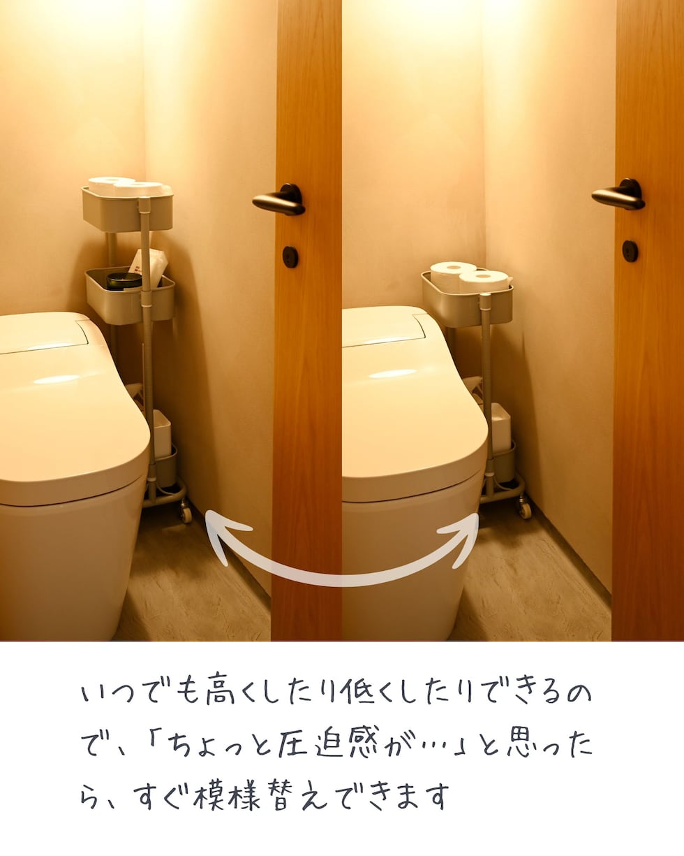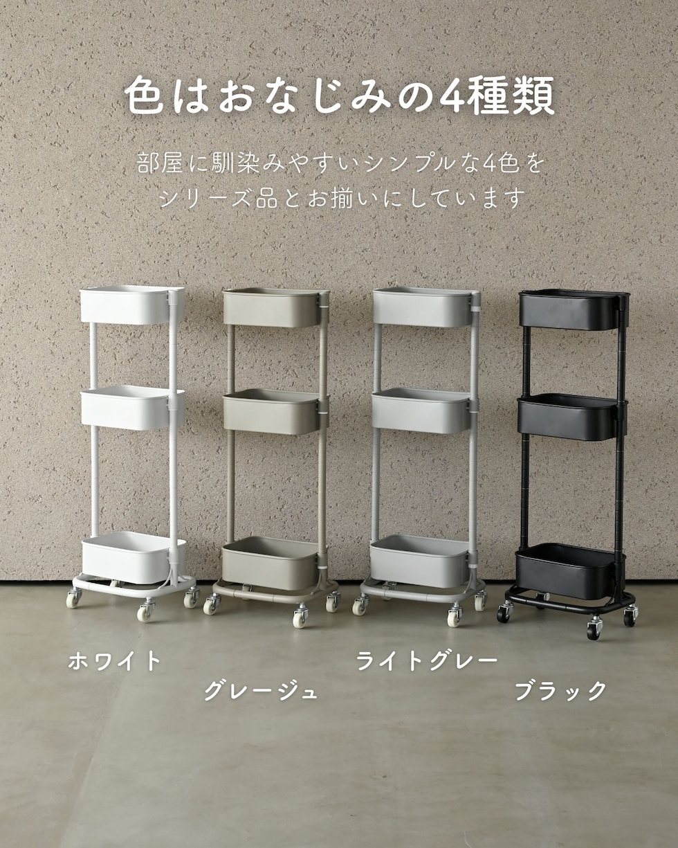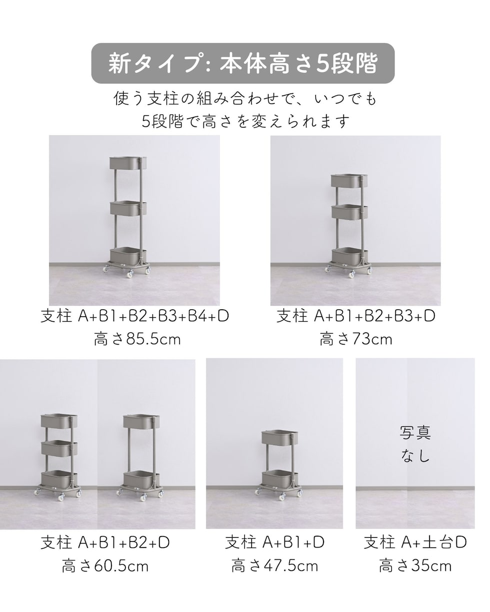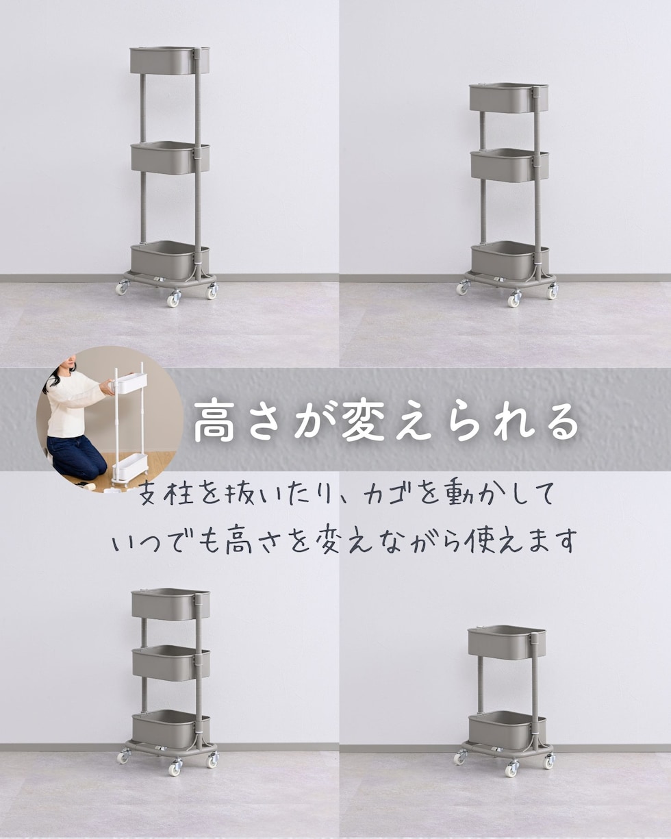 | 商品説明 | ●場所を取らずにすぐ使いたいモノをしまえる、コンパクトなワゴン収納 ●隙間や机の下、ソファの脇など邪魔にならずスイスイ動く小回りワゴン ●組み立て簡単、付属のスパナでキャスターを取り付けて、後は素手で組み立て可能 ●カゴの高さを2.5cm単位で調整できて、本体の高さを低くもできる、暮らしに合わせて変化する収納アイテム ●棚もカゴもフラットな網タイプの底板で、どの段も耐荷重10kgの丈夫なつくり ●スイスイ動く、滑らかなキャスター付き(ストッパーはなし) ●表面はツヤのないマットな質感で、お部屋になじみやすいカラーリング(ライトグレーのみサラサラ、他は少しザラつきあり) ●柱が5分割式、各高さは通常時高さ85.5cm、最小ロータイプ時は35cmで、最大5段階に調整可能 ●本体高さ: (1)85.5, (2)73, (3)60.5, (4)47.5, (5)35cm ●内寸(最大箇所):間口幅23.5 長さ17cm、深さ8.5cm ●下部フレーム下隙間5.5cm ●カゴの高さは約2.5cm間隔、全27段階調整 ●耐荷重:1段10kg、全体30kg |