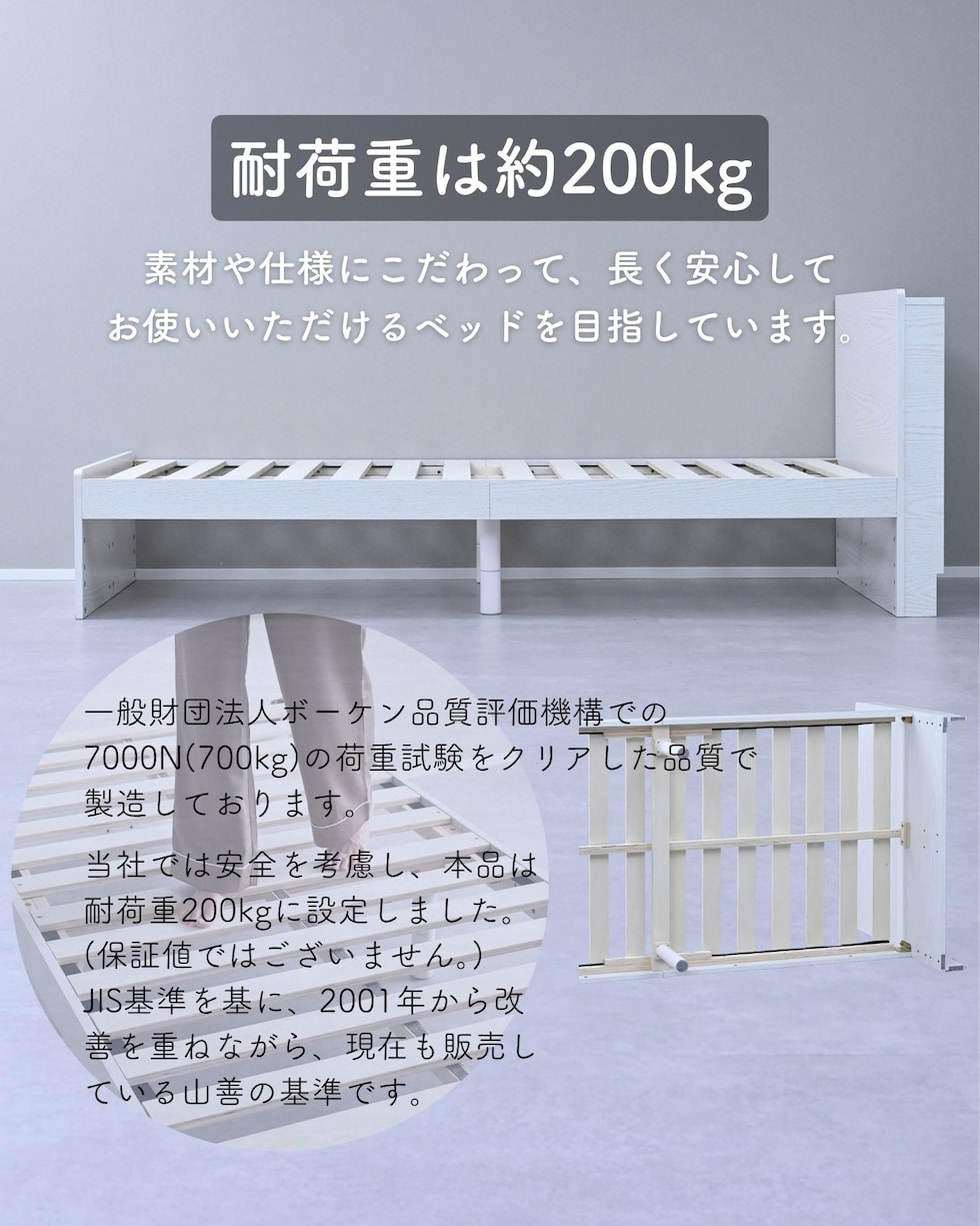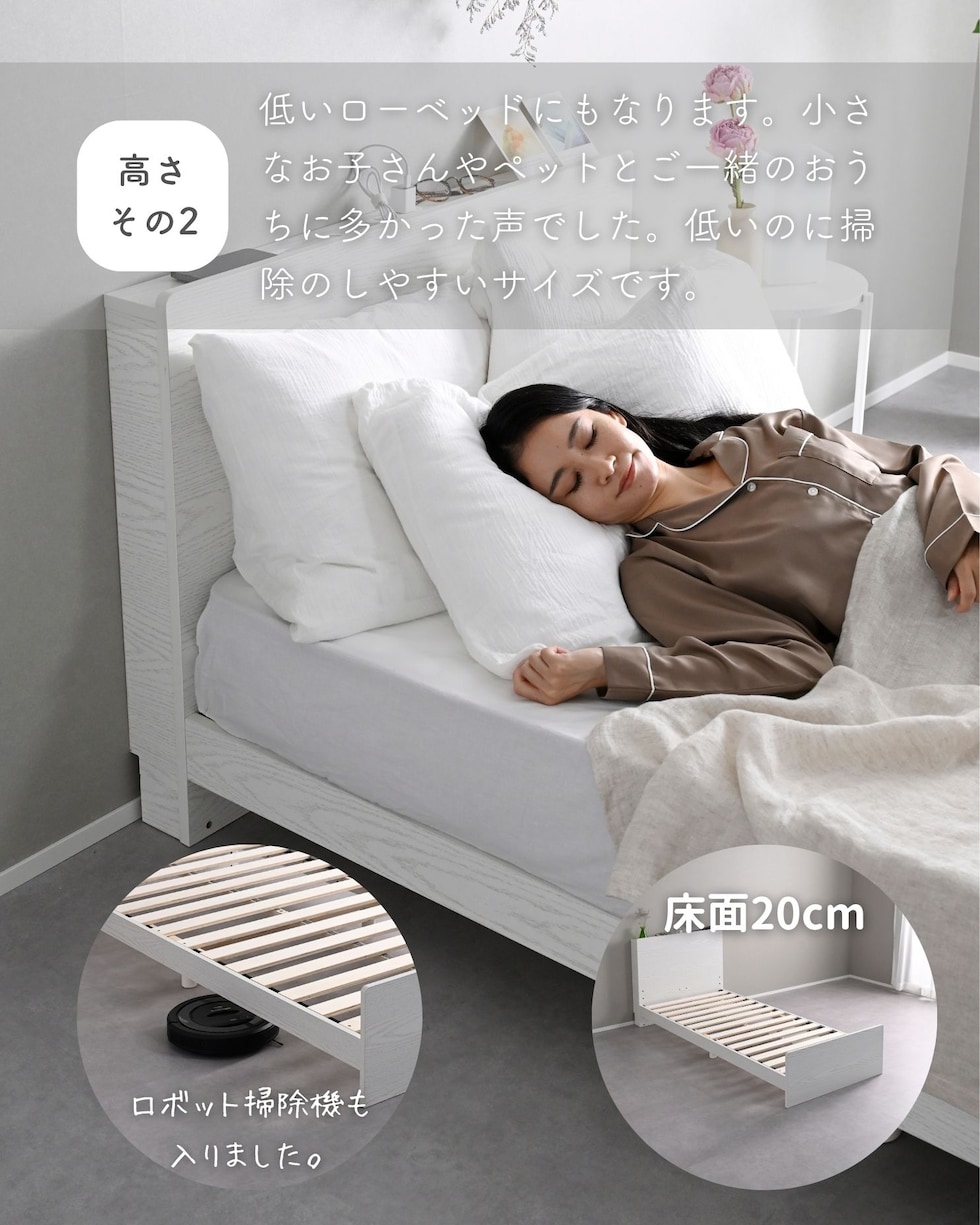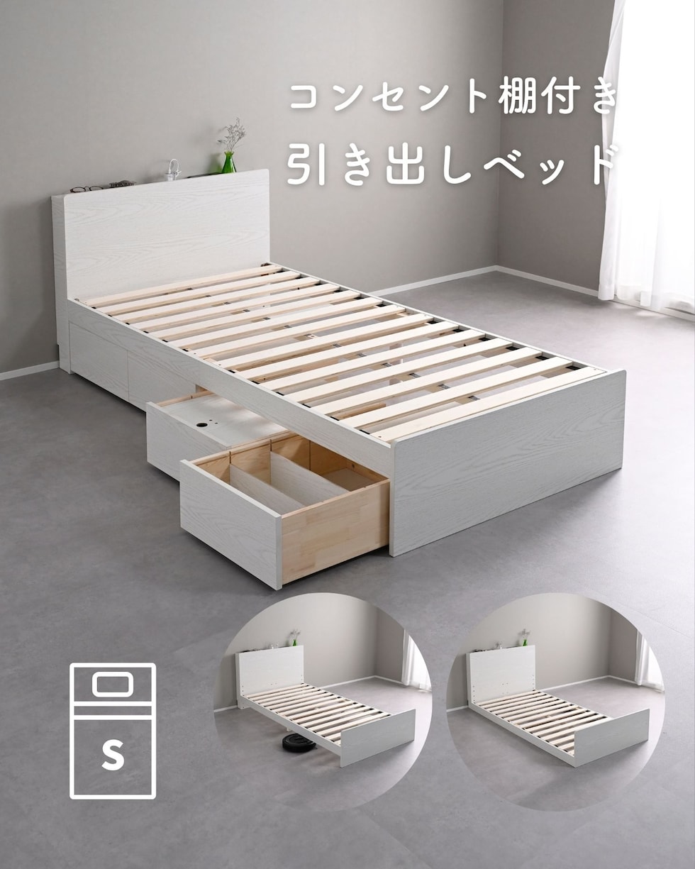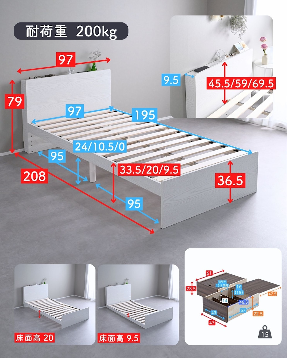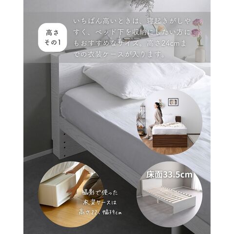 | 商品説明 | ●ベッドフレームは2梱包で重たい荷姿で玄関先までのお届けとなります。搬入、組み立て、設置はお二人以上での作業がおすすめです。 ●プラスドライバーをご用意ください。(六角レンチは付属あり) ●高さもゆったり、薄型の棚付きベッドフレーム ●ベッドは床面高さを3段階に調節可能 ※ヘッドボードは必ず壁付けして設置してください。 ●棚には2口コンセントが付いていて、枕元でスマホの充電が可能 ●棚は手前がこぼれ止めになっているので、壁に立てかければスタンドとしても活躍 ●棚内寸: 奥行9.5cm (中央に11×2cmのコンセントあり) ●こぼれ止め立ち上がり: 2cm ●2口コンセント、合計1500Wまで、コード長さ1.7m ●コンセントは棚のほぼ中央に配置 ●ホコリガードのフタ付きコンセント ●床面の高さは3段階で変更可能 ●【床面高さ33.5cm時】ベッド下には衣装ケースも置いて収納スペースとしても活躍 ●【床面高さ20cm時】ロボット掃除機も入ってベッド下の掃除もしやすい、ローベッド ●【床面高さ9.5cm時】ほぼ床寝スタイルのフロアベッド ●床面は厚み15mmのある積層材すのこを、補強フレームで支える、きしみも少ない頑丈設計 ●すのこ隙間: 約6.5cm(中央8.5)cm、7枚×2組で合計14枚すのこ ●フレームやヘッドボードには、湿気や傷に強い、メラミン樹脂化粧の素材を使用 ●脚部裏に貼り付けるフェルトシール付属 ●静止耐荷重: 200kg ※本製品は最大荷重試験の7000N(約700Kg)をクリアした商品です。当社では安全を考慮し、本商品はシングルベッド利用時は耐荷重200Kgに設定しております。耐荷重は保証値ではございません。 ●床面高さ: 33.5/20/9.5cm ●床からフットボード高さ36.5 ●床からヘッドボード高さ79、宮棚までの高さ77cm ●床面からヘッドボードまでの高さ:45.5/59/69.5cm ●床面サイズ: 幅97 長さ195cm ●ベッド下: 高さ24/10.5/0cm、幅95cm ●ベッド下を活用する、キャスター付き収納ボックス ●ベッドの幅を活用する、幅狭・奥深タイプ ●容量目安: 1杯あたり約40リットル ●奥深を活かせるよう、着脱式の仕切り付き ●仕切りを外せば大きなモノも収納可能 ●ホコリを防ぐ、スライド式のフタ付き(取っ手用の穴はあり) ●フタにはストッパーも付いて、抜け落ち防止 ●前後方向に動くキャスター付きで出し入れサポート (ベッド下に入り込まないように、別売りのベッド側にはストッパーも配備) ●裏面には補強桟も入ったしっかり構造 ●耐荷重15kg ●前板下側に隙間があって取っ手になっているので、前板の見た目すっきり ●引き出し内寸:幅43 奥行57 深さ15cm ●間口奥行: 46.5cm ●仕切り: 高さ14cm、13.5cm間隔で3カ所配置可能 ●取っ手径: 3.5cm ●1個につき、キャスター4個 (ストッパーなし・直線可動) |