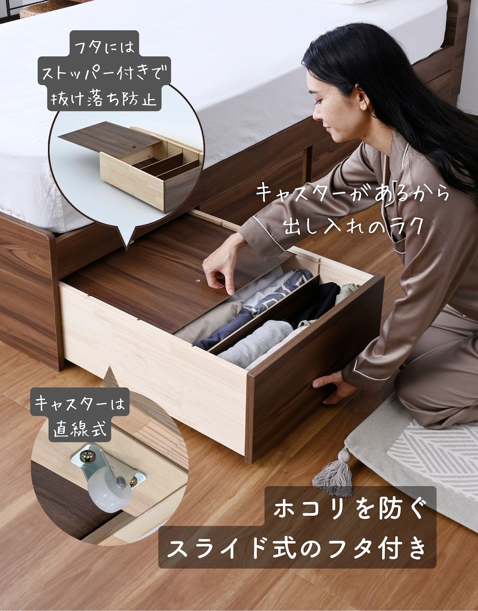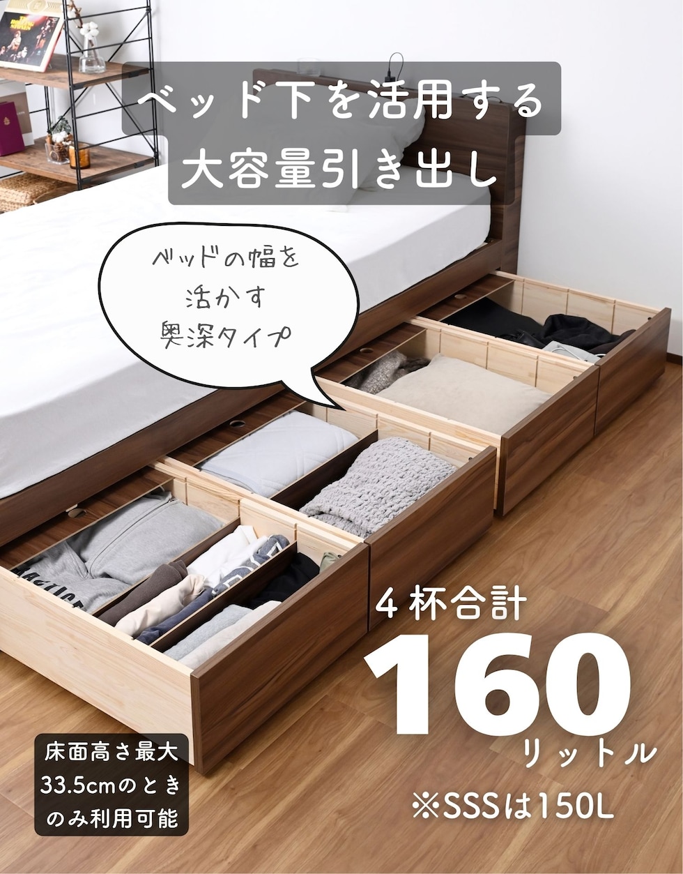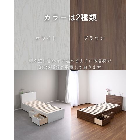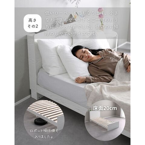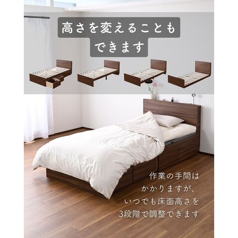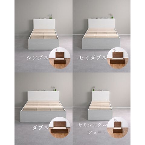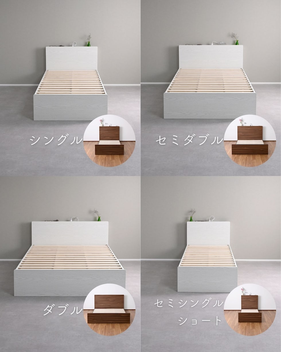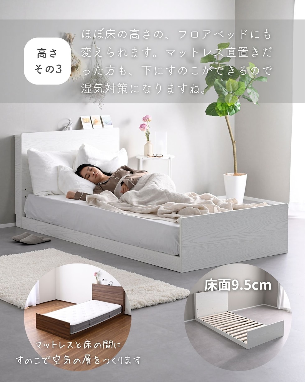 | 商品説明 | ●ベッドフレームは2梱包で重たい荷姿で玄関先までのお届けとなります。搬入、組み立て、設置はお二人以上での作業がおすすめです。 ●プラスドライバーをご用意ください。(六角レンチは付属あり) ●高さもゆったり、薄型の棚付きベッドフレーム ●ベッドは床面高さを3段階に調節可能 ※ヘッドボードは必ず壁付けして設置してください。 ●棚には2口コンセントが付いていて、枕元でスマホの充電が可能 ●棚は手前がこぼれ止めになっているので、壁に立てかければスタンドとしても活躍 ●棚内寸: 奥行9.5cm (中央に11×2cmのコンセントあり) ●こぼれ止め立ち上がり: 2cm ●2口コンセント、合計1500Wまで、コード長さ1.7m ●コンセントは棚のほぼ中央に配置 ●ホコリガードのフタ付きコンセント ●床面の高さは3段階で変更可能 ●【床面高さ33.5cm時】ベッド下には衣装ケースも置いて収納スペースとしても活躍 ●【床面高さ20cm時】ロボット掃除機も入ってベッド下の掃除もしやすい、ローベッド ●【床面高さ9.5cm時】ほぼ床寝スタイルのフロアベッド ●床面は厚み15mmのある積層材すのこを、補強フレームで支える、きしみも少ない頑丈設計 ●すのこ隙間: 約6.5cm(中央8.5)cm、7枚×2組で合計14枚すのこ ●フレームやヘッドボードには、湿気や傷に強い、メラミン樹脂化粧の素材を使用 ●脚部裏に貼り付けるフェルトシール付属 ●静止耐荷重: 200kg ※本製品は最大荷重試験の7000N(約700Kg)をクリアした商品です。当社では安全を考慮し、本商品はシングルベッド利用時は耐荷重200Kgに設定しております。耐荷重は保証値ではございません。 ●床面高さ: 33.5/20/9.5cm ●床からフットボード高さ36.5 ●床からヘッドボード高さ79、宮棚までの高さ77cm ●床面からヘッドボードまでの高さ:45.5/59/69.5cm ●床面サイズ: 幅97 長さ195cm ●ベッド下: 高さ24/10.5/0cm、幅95cm ●ベッド下を活用する、キャスター付き収納ボックス ●ベッドの幅を活用する、幅狭・奥深タイプ ●容量目安: 1杯あたり約40リットル ●奥深を活かせるよう、着脱式の仕切り付き ●仕切りを外せば大きなモノも収納可能 ●ホコリを防ぐ、スライド式のフタ付き(取っ手用の穴はあり) ●フタにはストッパーも付いて、抜け落ち防止 ●前後方向に動くキャスター付きで出し入れサポート (ベッド下に入り込まないように、別売りのベッド側にはストッパーも配備) ●裏面には補強桟も入ったしっかり構造 ●耐荷重15kg ●前板下側に隙間があって取っ手になっているので、前板の見た目すっきり ●引き出し内寸:幅43 奥行57 深さ15cm ●間口奥行: 46.5cm ●仕切り: 高さ14cm、13.5cm間隔で3カ所配置可能 ●取っ手径: 3.5cm ●1個につき、キャスター4個 (ストッパーなし・直線可動) |