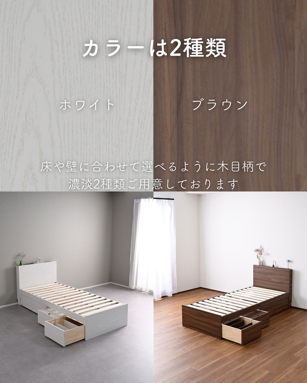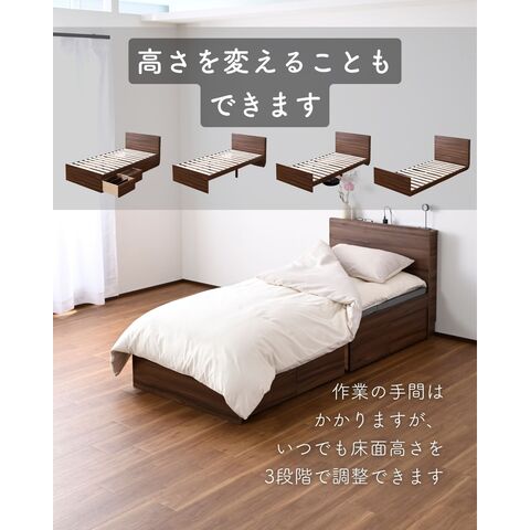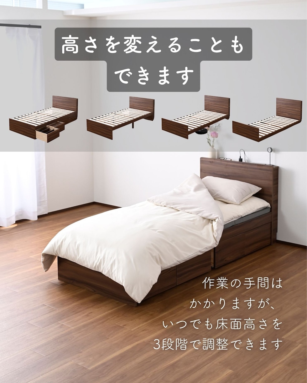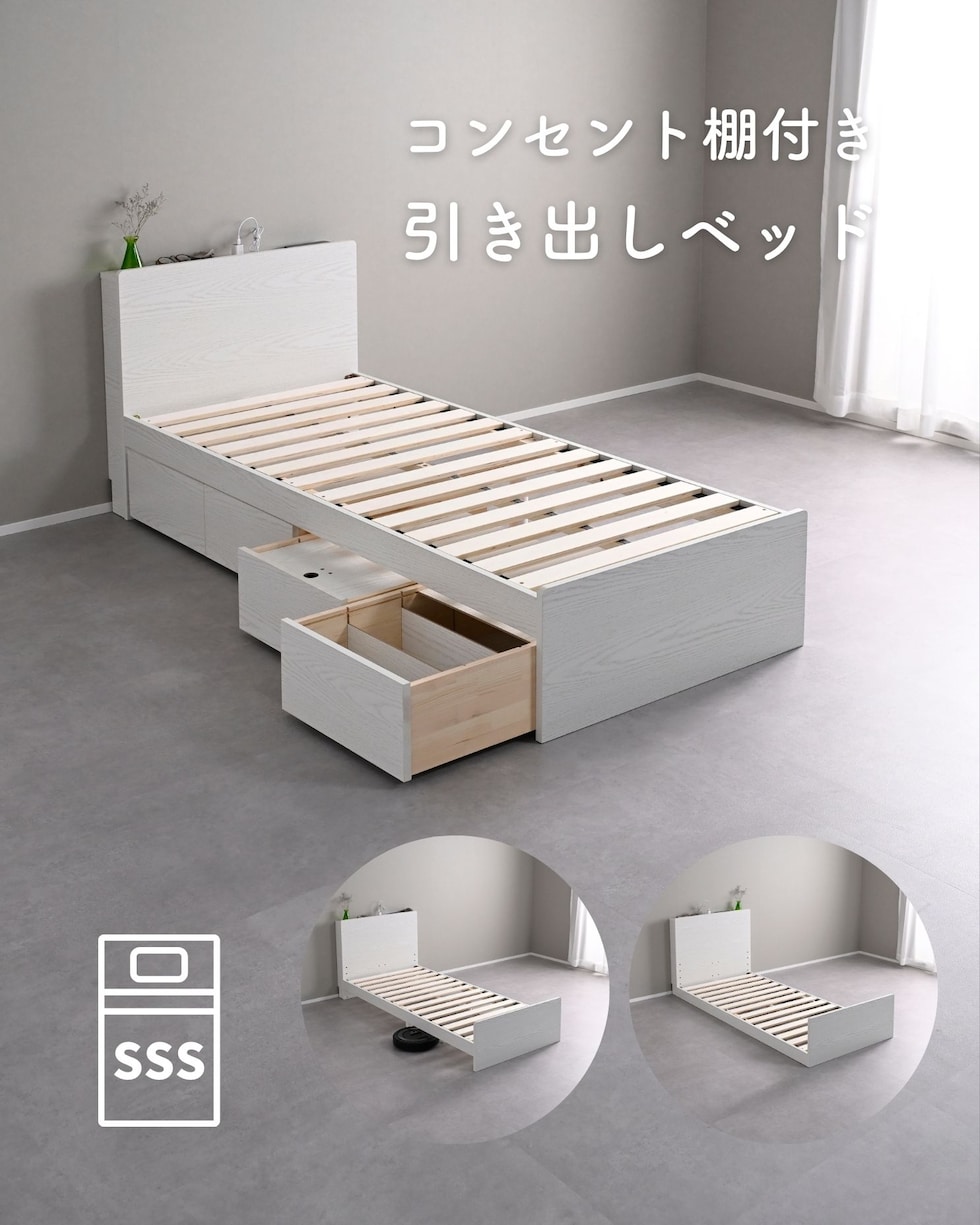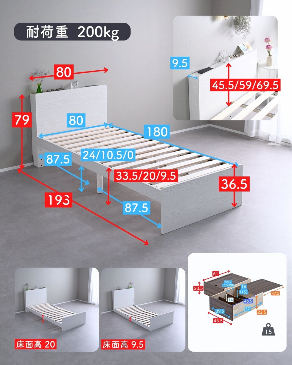 | 商品説明 | ●ベッドフレームは2梱包で重たい荷姿で玄関先までのお届けとなります。搬入、組み立て、設置はお二人以上での作業がおすすめです。 ●プラスドライバーをご用意ください。(六角レンチは付属あり) ●高さもゆったり、薄型の棚付きベッドフレーム ●ベッドは床面高さを3段階に調節可能 ※ヘッドボードは必ず壁付けして設置してください。 ●棚には2口コンセントが付いていて、枕元でスマホの充電が可能 ●棚は手前がこぼれ止めになっているので、壁に立てかければスタンドとしても活躍 ●棚内寸: 奥行9.5cm (中央に11×2cmのコンセントあり) ●こぼれ止め立ち上がり: 2cm ●2口コンセント、合計1500Wまで、コード長さ1.7m ●コンセントは棚のほぼ中央に配置 ●ホコリガードのフタ付きコンセント ●床面の高さは3段階で変更可能 ●【床面高さ33.5cm時】ベッド下には衣装ケースも置いて収納スペースとしても活躍 ●【床面高さ20cm時】ロボット掃除機も入ってベッド下の掃除もしやすい、ローベッド ●【床面高さ9.5cm時】ほぼ床寝スタイルのフロアベッド ●床面は厚み15mmのある積層材すのこを、補強フレームで支える、きしみも少ない頑丈設計 ●すのこ隙間: 約6.5cm(中央8.5)cm、7枚×2組で合計14枚すのこ ●フレームやヘッドボードには、湿気や傷に強い、メラミン樹脂化粧の素材を使用 ●脚部裏に貼り付けるフェルトシール付属 ●静止耐荷重: 200kg ※本製品は最大荷重試験の7000N(約700Kg)をクリアした商品です。当社では安全を考慮し、本商品はシングルベッド利用時は耐荷重200Kgに設定しております。耐荷重は保証値ではございません。 ●床面高さ: 33.5/20/9.5cm ●床からフットボード高さ36.5 ●床からヘッドボード高さ79、宮棚までの高さ77cm ●床面からヘッドボードまでの高さ:45.5/59/69.5cm ●床面サイズ: 幅80 長さ180cm ●ベッド下: 高さ24/10.5/0cm、幅87.5cm ●ベッド下を活用する、キャスター付き収納ボックス ●ベッドの幅を活用する、幅狭・奥深タイプ ●容量目安: 1杯あたり約37.5リットル ●奥深を活かせるよう、着脱式の仕切り付き ●仕切りを外せば大きなモノも収納可能 ●ホコリを防ぐ、スライド式のフタ付き(取っ手用の穴はあり) ●フタにはストッパーも付いて、抜け落ち防止 ●前後方向に動くキャスター付きで出し入れサポート (ベッド下に入り込まないように、別売りのベッド側にはストッパーも配備) ●裏面には補強桟も入ったしっかり構造 ●耐荷重15kg ●前板下側に隙間があって取っ手になっているので、前板の見た目すっきり ●引き出し内寸:幅39.5 奥行57 深さ15cm ●間口奥行: 46.5cm ●仕切り: 高さ14cm、13.5cm間隔で3カ所配置可能 ●取っ手径: 3.5cm ●1個につき、キャスター4個 (ストッパーなし・直線可動) |