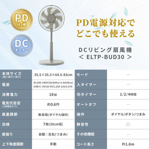 扇風機 DCモーター 30cm PD対応 リビング扇風機 dc扇風機 静音 切タイマー 無段階風量調節 ELTP-BUD30(C) DCリビング扇風機 左右首振り 首ふり モバイルバッテリーでも動かせる 換気 山善 YAMAZEN 【送料無料】