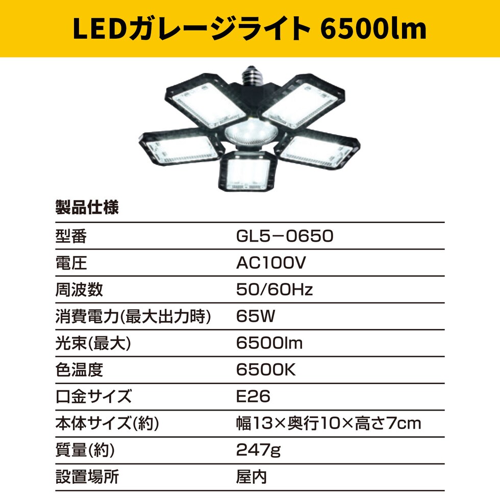 | 商品説明 | ●【GL5-0650】 ●電圧:AC100V ●周波数:50/60Hz ●消費電力:65W ●光束(最大):6500lm ●色温度:6500K ●口金(ソケット)サイズ:E26 ●設置場所:屋内 ※防水仕様ではないため屋外ではご使用頂けません。 ●夜間の屋内作業に ●DIYやガレージの整備作業に ●アウトドアやキャンプでも活躍 ●災害や停電の備えとして 【ポータブル】 ●電圧:AC100V ●周波数:50/60Hz ●電源コード長さ:3m ●口金(ソケット)サイズ:E26 ●ソケットホルダーは角度・縦横自由調整可能 ●フレームは0~60度まで調整可能 ●クリップは最大4cmの厚さまで挟むこと可能 ●S字フックも付属で引っ掛けて使用も可能 ●設置場所:屋内 |