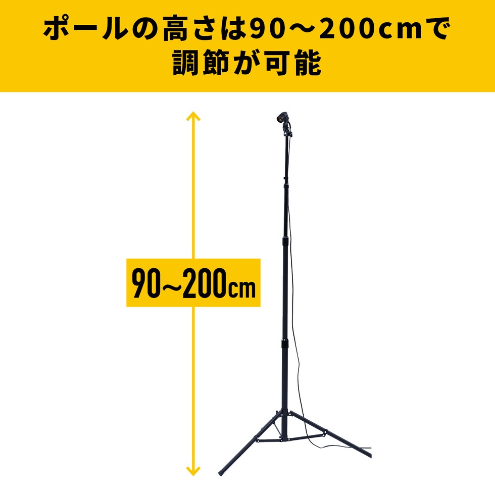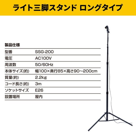 | 本体サイズ | 【ライト】 幅25×奥行25×高さ8cm 重量490g 【スタンド】 ロングタイプ三脚:幅100×奥行85×高さ90-200cm 重量2.2kg |