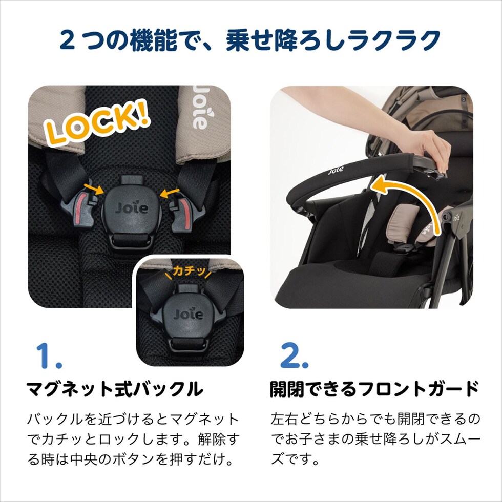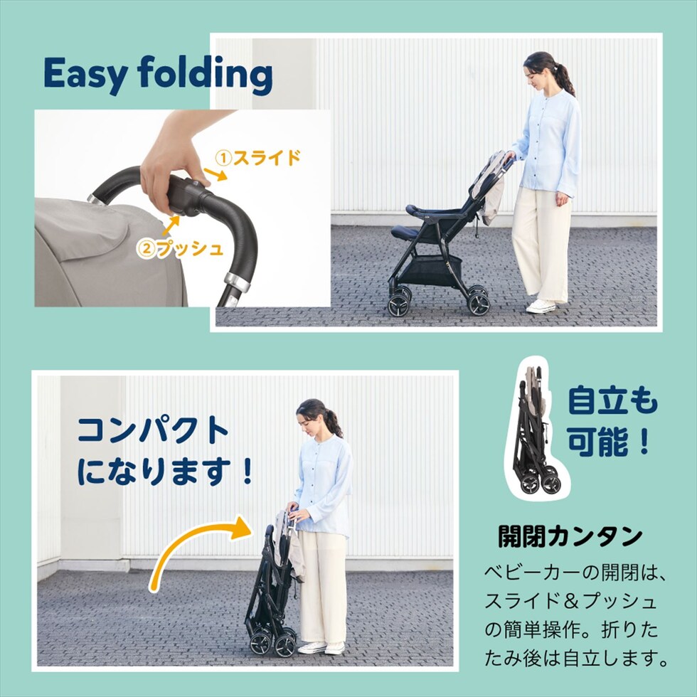 | 商品説明 | ●使用対象:生後1か月から体重15kg(3歳頃) ●重量4kg台の軽量モデルなので持ち運びもラクラク ●開閉はスライド&プッシュの簡単操作 ●幅47cmのコンパクト設計 ●マグネット式バックルを採用 ●フロントガードは開閉可能 ●通気性に優れた3Dメッシュシート ●リクライニングとフットレストは角度調節可能 ●収納カゴ付き(耐荷重4.5kg) ●専用レインカバー付き ●折りたたみ時自立可能 ●折りたたみサイズ:幅47×奥行33×高さ95cm |