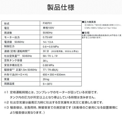 | 商品説明 | ●メンテナンスが容易なオイルフリー式 ●用途:空気入れ・エアブロー・釘打ち・インパクトレンチボルトナット締付け・塗装・穴あけ・切断 ●1馬力 ●単相100V 50/60Hz兼用 ●タンク容量:38L ●騒音値:77/79dB(A) ●メーカー保証:6か月 |