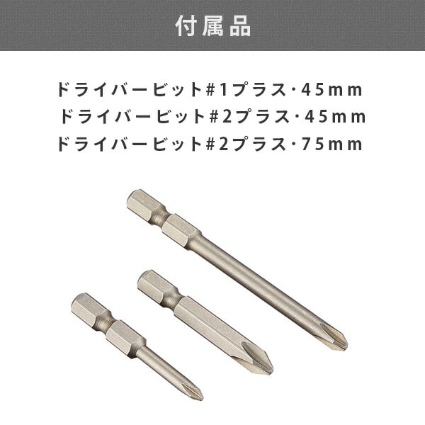 | 商品説明 | ●軽く、小さく、使いやすい ●ネジの締めすぎを防止 ●チャック:ワンタッチチャック(段付までの寸法が11.5mm) ●最大締付トルク(弾性体締付トルク):【高速】1.5N・m(15kgf・cm) 【低速】2.4N・m(24kgf・cm) ●回転数:【高速】400回転/分 【低速】200回転/分(2段変速) ●クラッチ作動トルク:多段階 約0.4~2.0N・m(4~20kgf・cm) ●付属品:ドライバービット#1プラス 45mm、ドライバービット#2プラス 45mm、ドライバービット#2プラス 75mm |