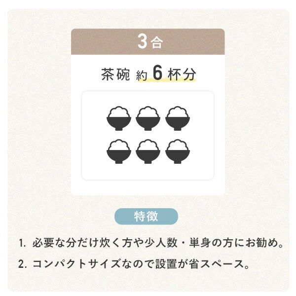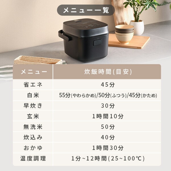 | 商品説明 | ●電源:AC100V(50/60Hz) ●消費電力:425W ●電源コード長さ:約1.2m ●最大炊飯容量:0.54L(3合) ●炊飯方式:マイコン式 ●蒸発水量:4.7g ●年間消費電力:36.1kWh/年 ●1回当たりの炊飯時消費電力:84.7Wh ●1時間当たりの保温時消費電力:10.3Wh ●1時間当たりのタイマー予約時消費電力:0.57Wh ●1時間当たりの待機時消費電力:0.59Wh ●付属品:しゃもじ、おかゆ用しゃもじ、計量カップ、無洗米専用計量カップ、電源コード ●メーカー保証:1年間 ※2025年9月から型番がYJR-DM051からYJT-M05に変更しております 【仕様変更点】 ・デザインを見直して丸みを帯びたデザインから四角い形状のデザインに変更しております ・メニューに温度調理を搭載し低温調理から煮込み調理ができます ・本体にハンドルを付属してより便利にお使いいただけるようにしました ・炊き分けメニューに一部変更がございます。従来のお湯炊き/雑穀米/パンを廃止して、無洗米/温度調理を搭載しております |