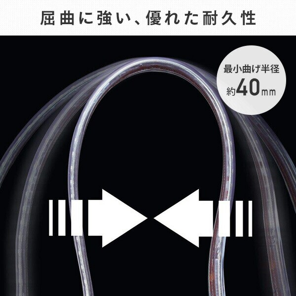 | 商品説明 | ●驚異の明るさ!1m当たりの全光束900Lm! ●最大50mまで連結可能なのでトンネル工事の仮設灯や誘導灯など長い距離を照明できる ●耐衝撃保護等級「IK14」!屈曲に強く優れた耐久性で車に踏まれても大丈夫 ●万一の断線時も故障箇所だけ切除し専用補修キット(オプション)で修理可能持ち運びに便利な収納袋付。前面のポケットには社名などの表示物が入れられる(セットタイプのみ) ●発光面長:10m ●消費電力:110W ●定格:AC100V・50/60Hz ●全光束900Lm(1m当たり) ●消費電力:11W/m ●質量:2.0kg(テープライトのみ)、0.3kg(電源ケーブル) ●連結点灯:最大50mまで |