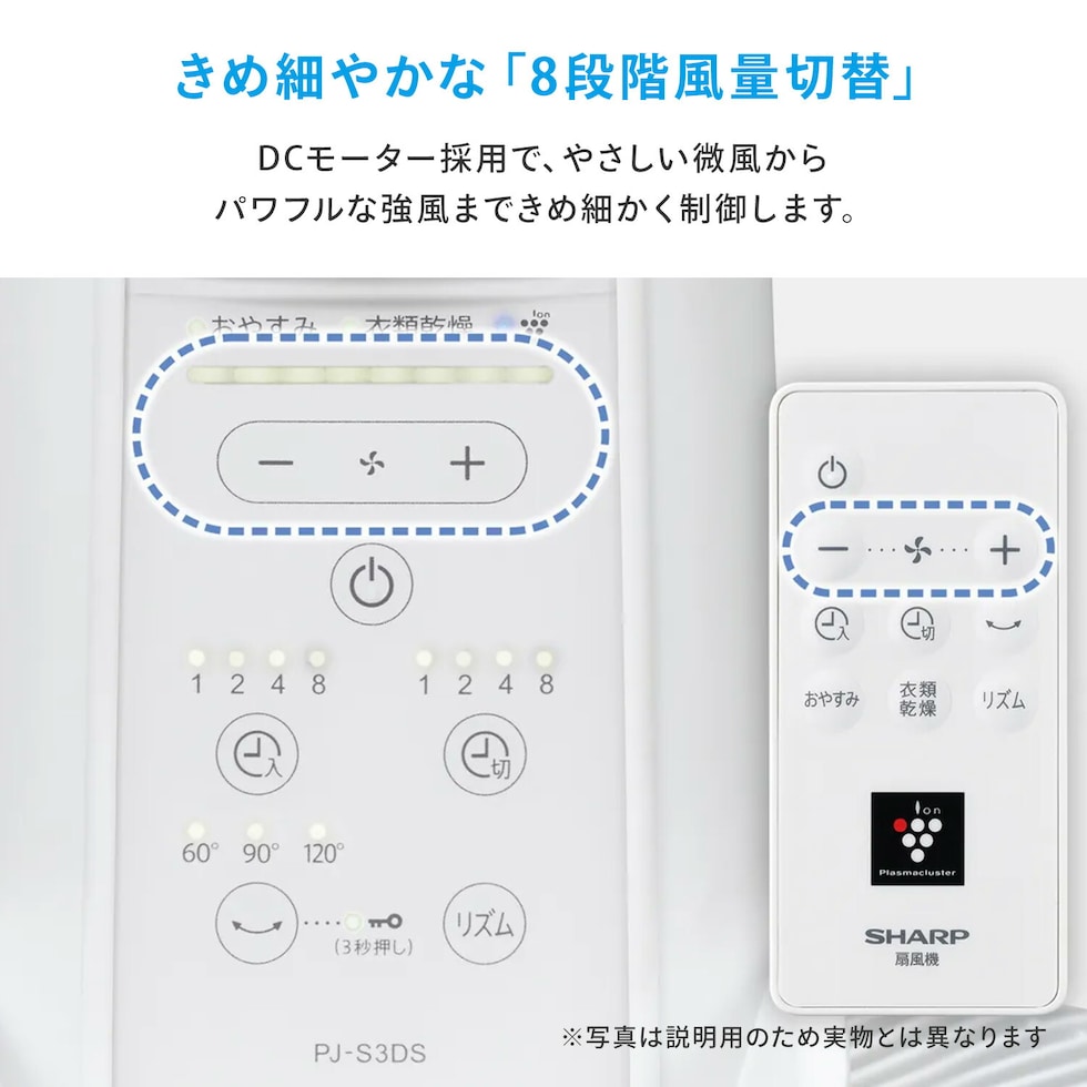 | 商品説明 | ●消費電力(50/60Hz):21W(2.2W) ※風量最大運転時、左右首振りあり。風量最小運転時、左右首振りなし。 ●風量切替:8段階(リズム風あり) ●タイマー入/切:1/2/4/8h(同時設定可) ●首振り:上約90度/下約10度(手動・無段階調整)、左右約60度/90度/120度(自動) ●プラズマクラスター適用床面積の目安:約10畳 ※商品を壁際に置いて、「風量最大」運転時に部屋中央(床上1.2m)で7,000個/cm3のイオンが測定できる床面積の目安 ●モーター:DCモーター ●おやすみモード:表示部の明るさを抑え、切タイマーと連動して風量を徐々に弱めます ●衣類乾燥モード:プラズマクラスターで部屋干しした時に気になるイヤなニオイを消臭 ※吹き出し方向約50cmの位置での効果です。吹き出す風が当たらない部分のニオイは取れません。 ●チャイルドロック機能付き ●サーキュレーターとしても活躍 ●コード長さ:約1.8m ●付属品:リモコン、リモコンホルダー、清掃ブラシ ※2026年3月より型番をPJ-S3DS-W→PJ-T3DS-Wに変更しております。仕様変更点はございません |