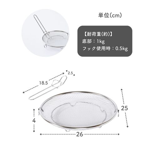 | 商品説明 | ●使う時だけ取っ手を装着する浅型のステンレス製のザル ●便利な持ち上げフック付きで、直接触れずに移動可能 ●取っ手がないから、鍋やフライパンの容量を目いっぱい使える便利設計 ●揚げ物の油切りとしても活躍 ●そのままお皿の中でも収まりが良いので、お皿に移動して食器としてもOK ●シリーズの水切りカゴよりも脚の高さを5mm上げているので、底面が接地しづらく蒸し料理にも最適 ●しっかり振って水切りしたい時も安定する、両サイドリング付き ●吊り下げ収納可能 ●ステンレス製だから、食洗機で丸洗い可能 |