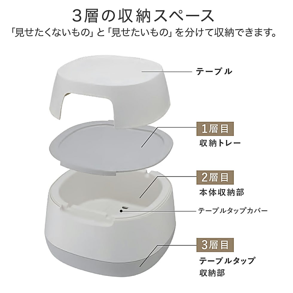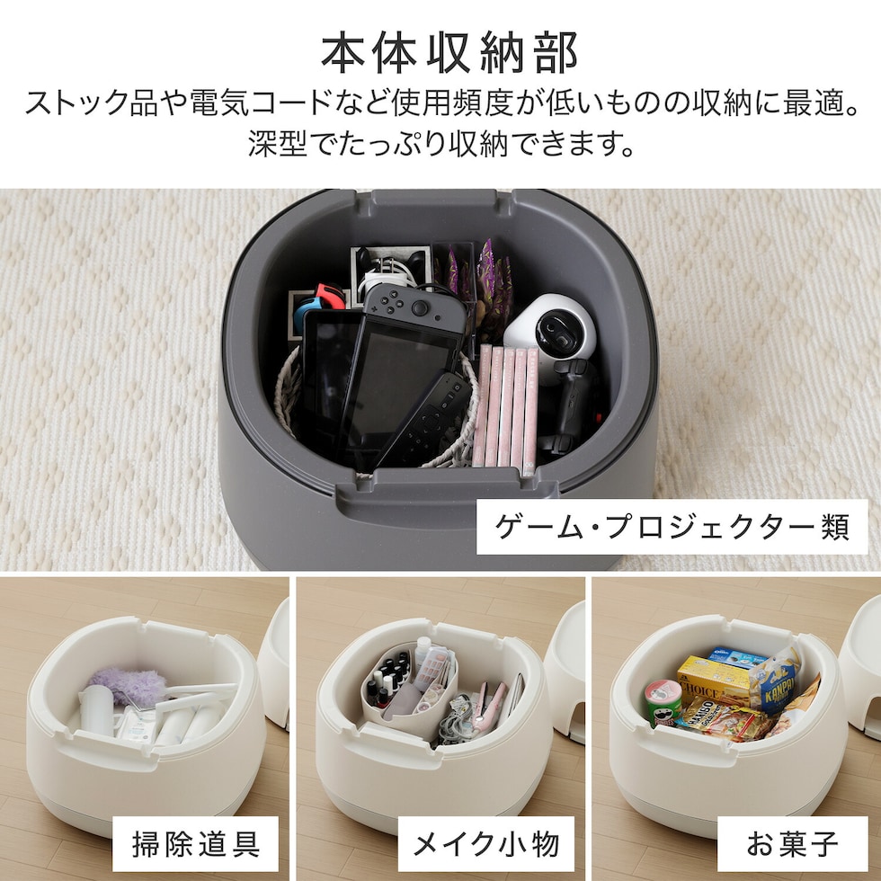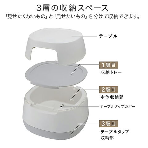 | 商品説明 | ●ごちゃごちゃしたリビングもすっきり片付く収納付きローテーブル ●テーブルは物が転がり落ちにくい仕様 ●「隠す/見せる」を使い分けできる三層構造 ●底部にはタップ収納&配線穴付き ●お好みで取り付けられるキャスター付き ●耐荷重:上本体 20kg、トレー2kg、本体(テーブルタップカバー含む)20kg |