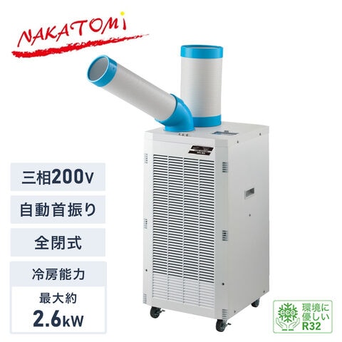 | ナカトミ NAKATOMI 【代引不可】【法人・施設限定】 スポットクーラー 三相200V 自動首振り 全閉式モーター 冷媒R32 エコ冷媒 キャスター付き 排熱ダクト付き SPC-26S |