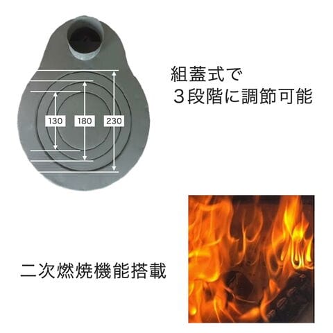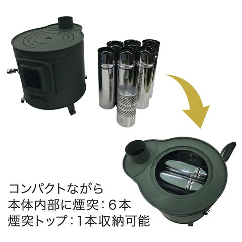 | 商品説明 | ●時計型薪ストーブの最小モデル!保管・持ち出しが容易なアウトドア用薪ストーブセット ●コンパクトながら本体内に煙突を6本収納可能 ●防災用ストーブとしても活躍 ●前面扉にガラス扉を採用。炎の揺らぎでリラックス効果 ●組蓋式で鍋に合わせて調節可能 ●重量5kgで軽く、持ち運びも楽々 ●煙突径:直径80mm※他社製煙突とは接続出来ない場合がございます ●最大薪長さ:350mm ●二次燃焼機能搭載(煙、においを軽減) ●煙突位置:上面 ●付属品:専用L300直筒6本、専用トップ1個 |