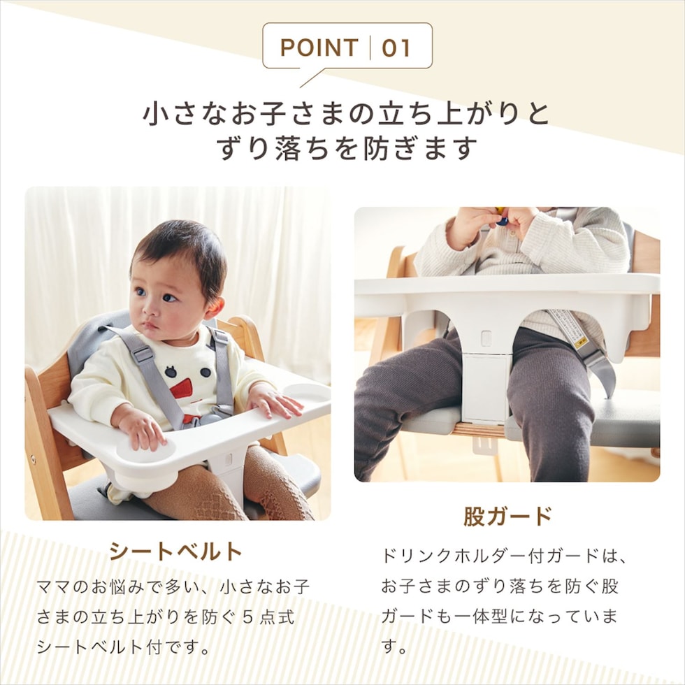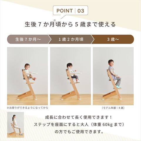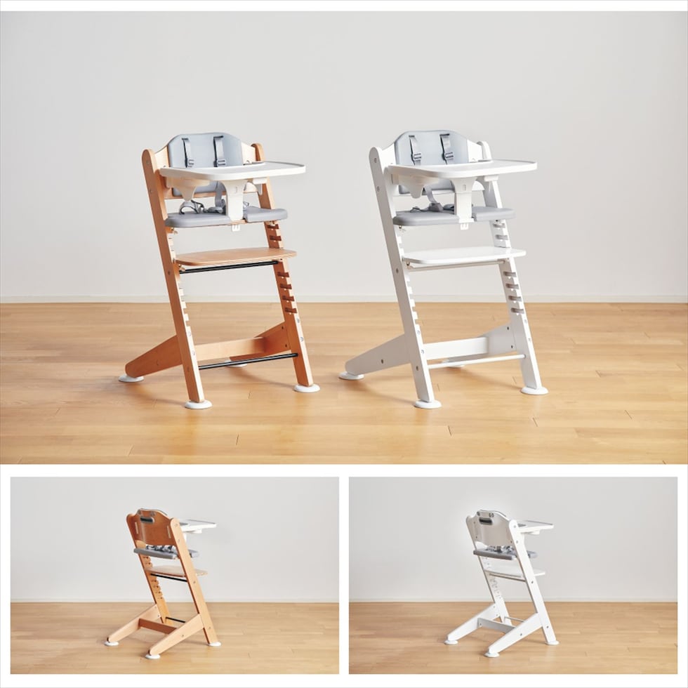| 材質 | 脚・補強木:ブナ無垢材 座面・ステップ・背もたれ:積層合板(中身/ポプラ材、表面/ブナ材) 丸棒:スチール テーブル・ガード:ポリプロピレン スタビライザー:ポリプロピレン クッション:EVAフォーム 座面・ステップアジャストボタン:ABS樹脂 バックル・ベルトアジャスター:POM ベルト:ナイロン |